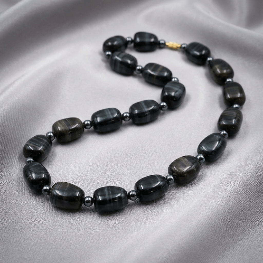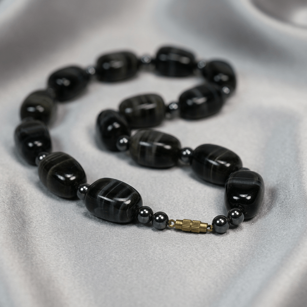Deep charcoal banded agate beaded gemstone necklace with structured handmade construction and polished natural finish. Distributed from Canada.