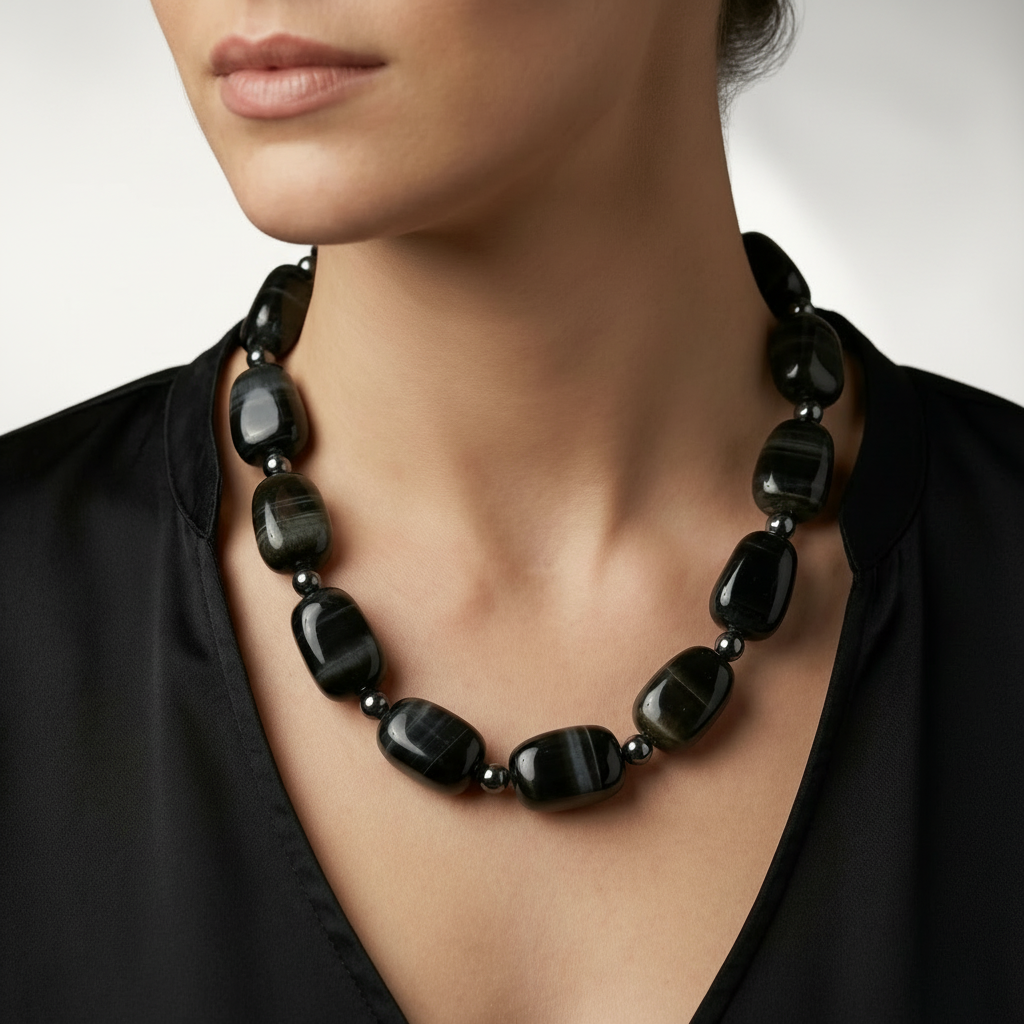 A bold sequence of deep charcoal banded agate anchors this composition, each polished form spaced with restrained metallic accents to create measured rhythm along the neckline. The alternating geometry introduces balance — rounded transitions between larger sculpted stones soften the structure without diminishing presence.