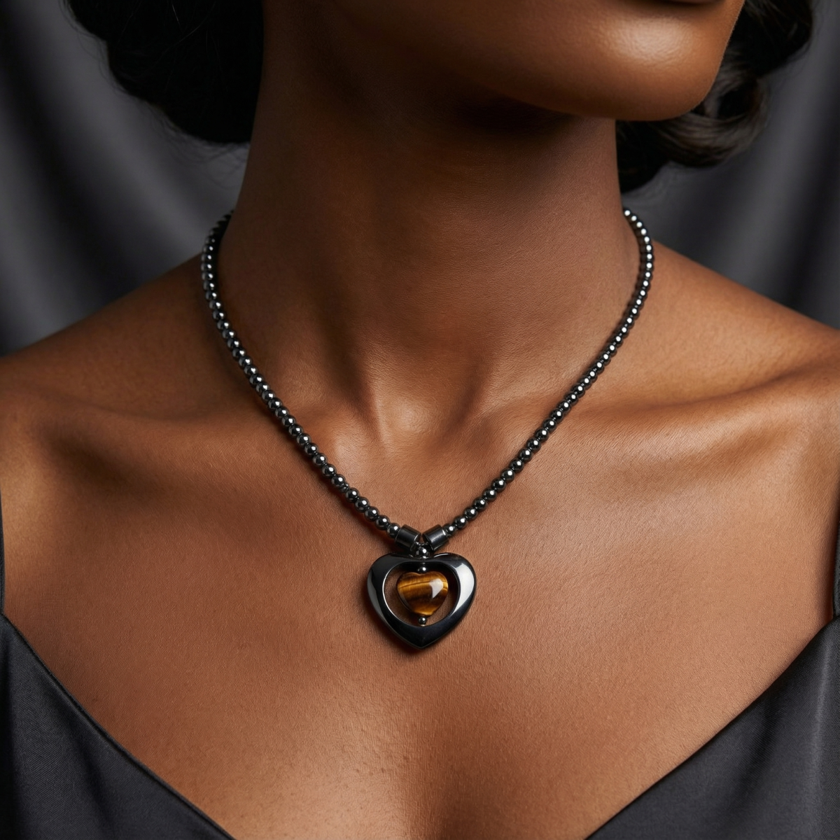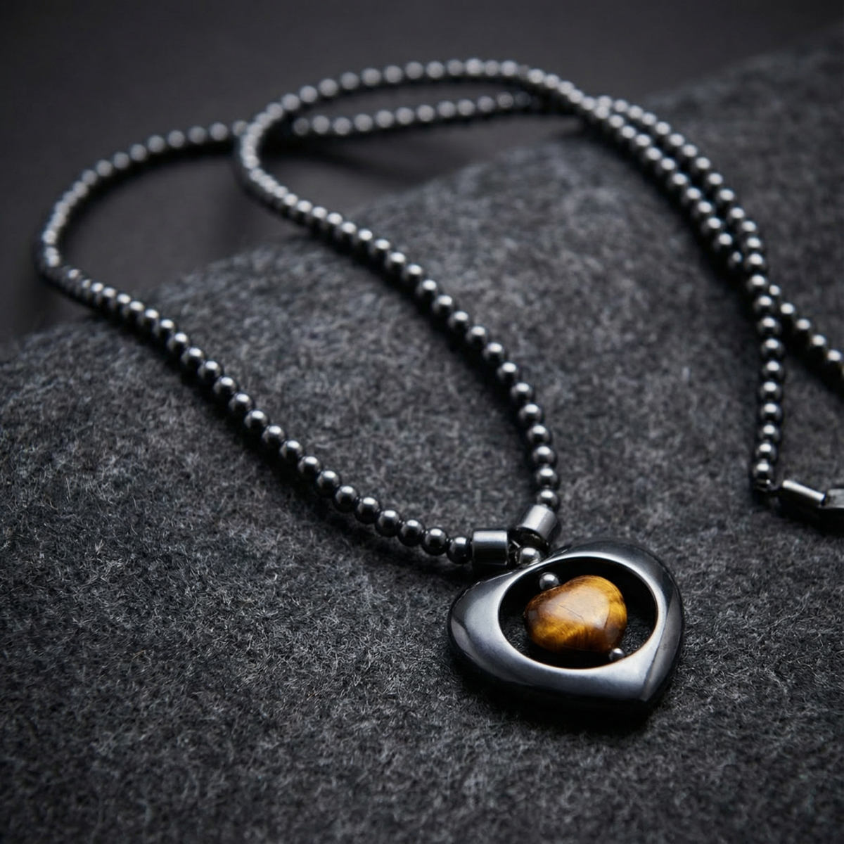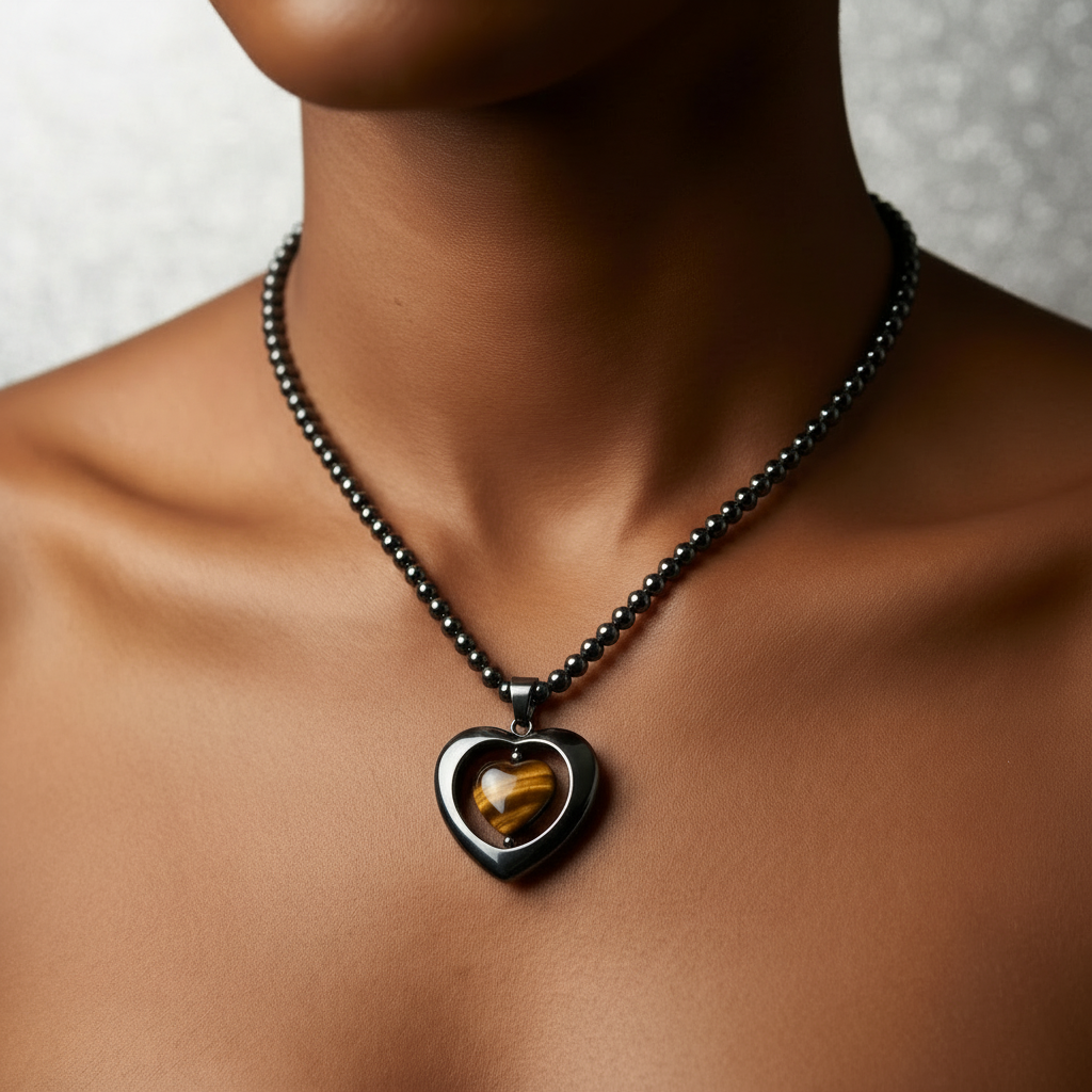 A suspended heart silhouette defines this composition, framed in polished black hematite and centered with a tiger eye heart core. The pendant rests deliberately along a strand of fine, uniform hematite beads, creating a controlled transition from minimal structure to focal intensity.