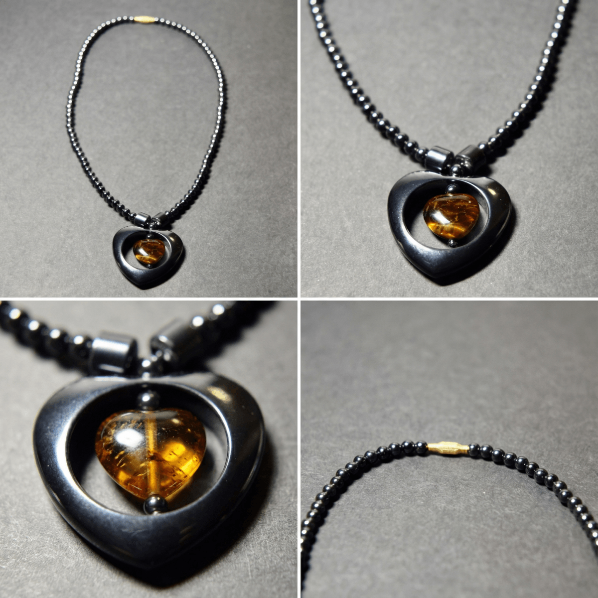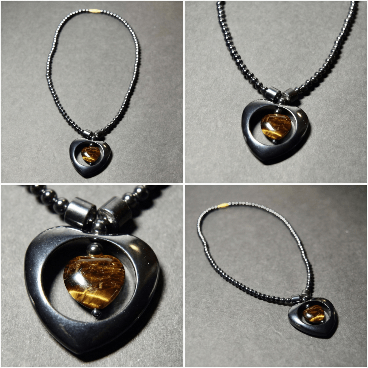 This black hematite and tiger eye heart pendant beaded gemstone necklace features polished metallic hematite beads with a golden-brown tiger eye centrepiece; slight variations in tone and natural patterning may occur due to its handcrafted construction.