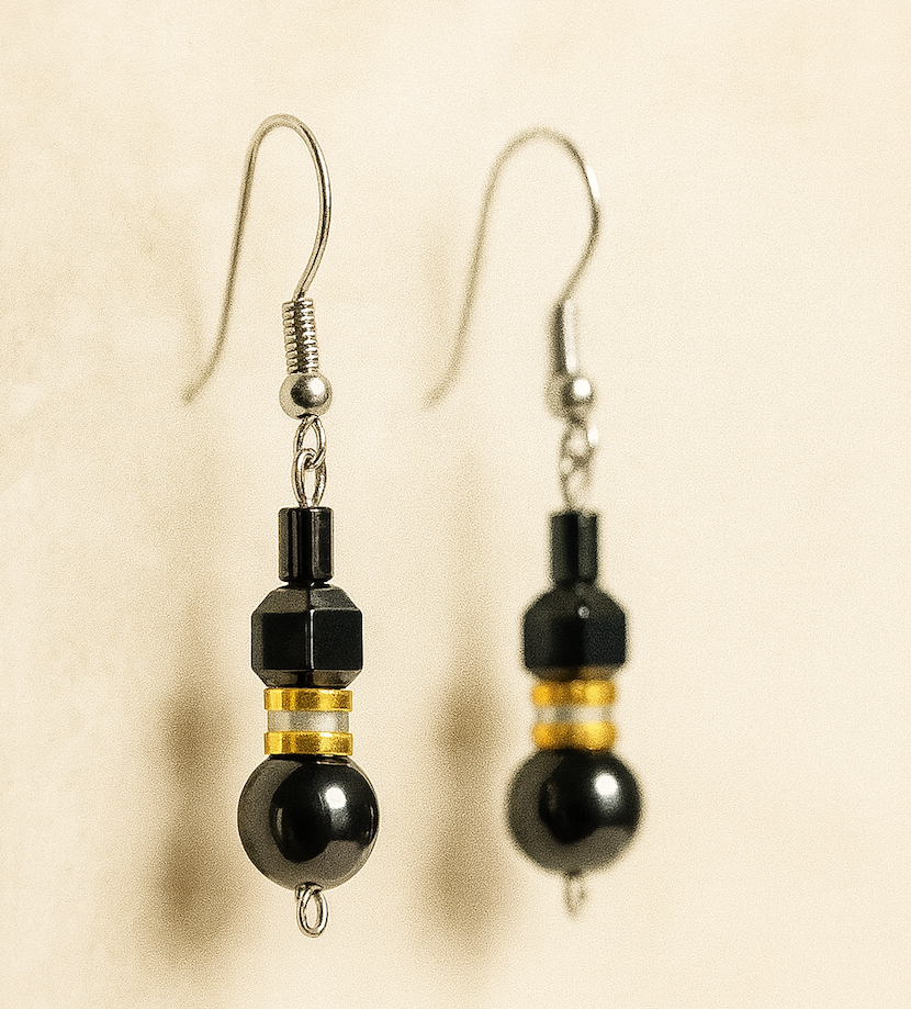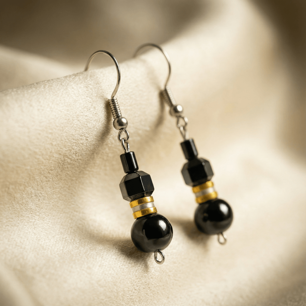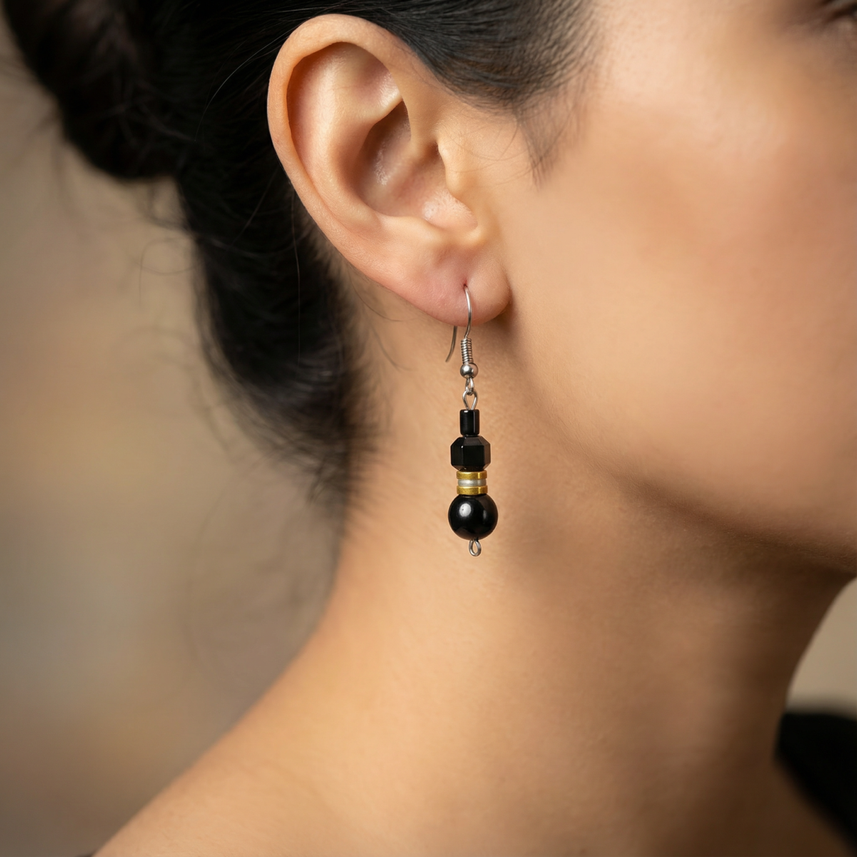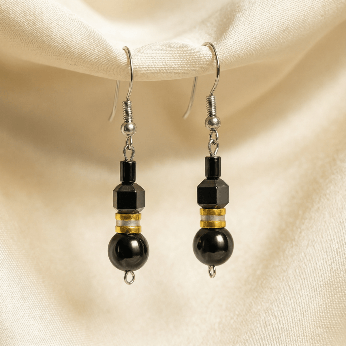 Black Geometric Bead Drop Earrings with Gold Accents