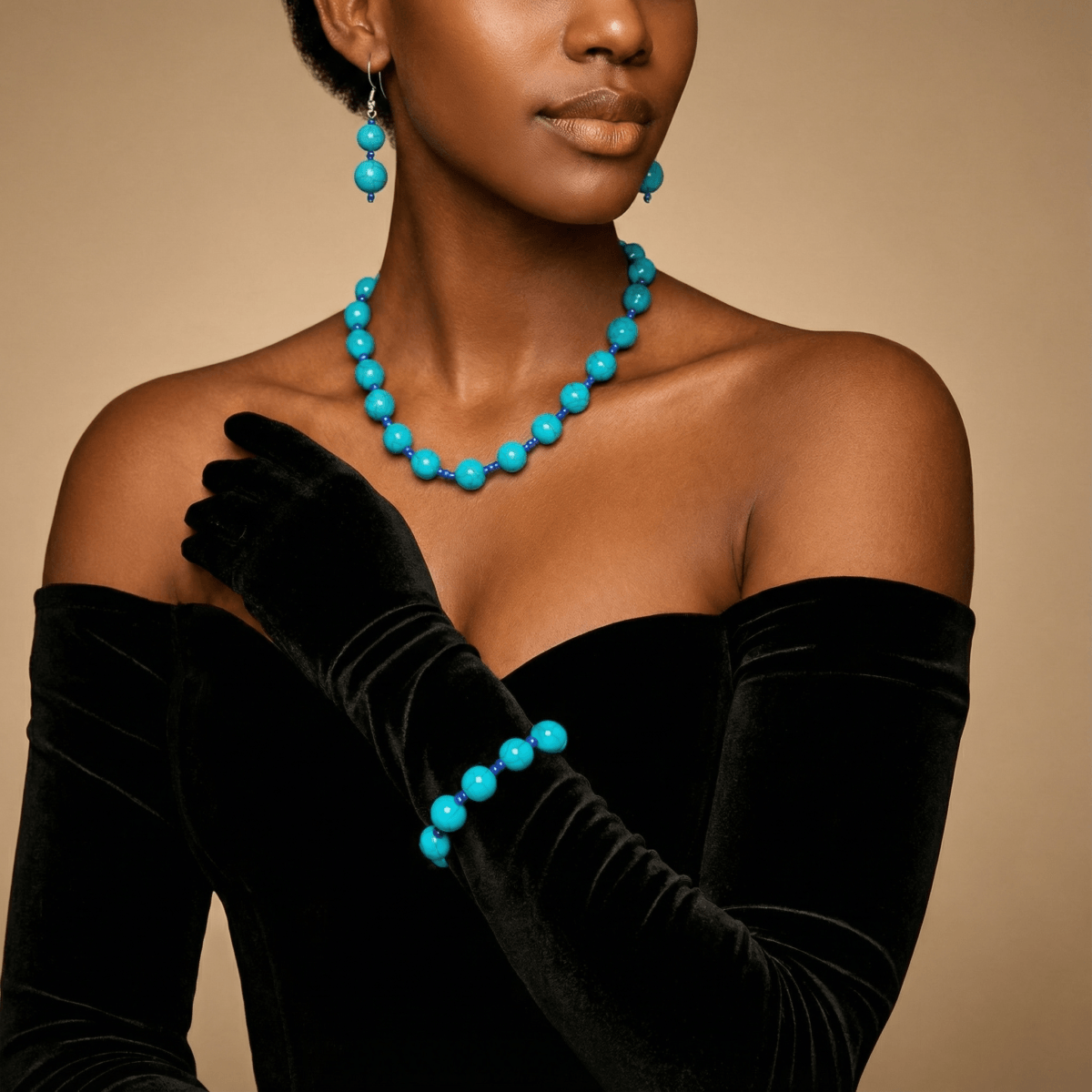 This turquoise jewelry set includes a necklace, bracelet, and earrings made with natural turquoise stones. This turquoise jewelry set is a handcrafted gemstone jewelry set and part of the MPENZII Lelo Collection. Turquoise stones are arranged in a measured sequence, their saturated blue-green tones offering a calm yet commanding presence against the skin.