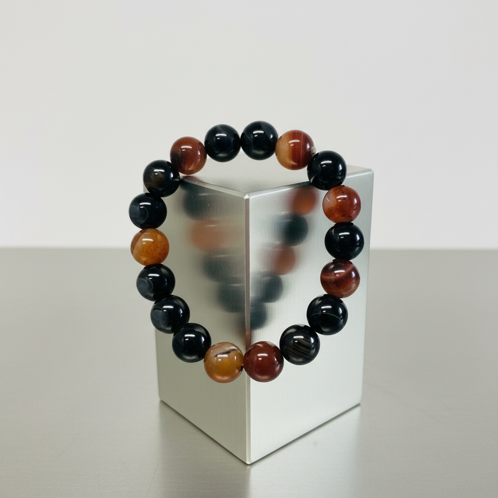 A tonal contrast composition balancing oxidized black depth with warm ember-red carnelian variation. Designed with rounded, uniform beads to create measured visual cadence and weight distribution across the wrist. The alternating pattern introduces controlled contrast while preserving overall compositional harmony.