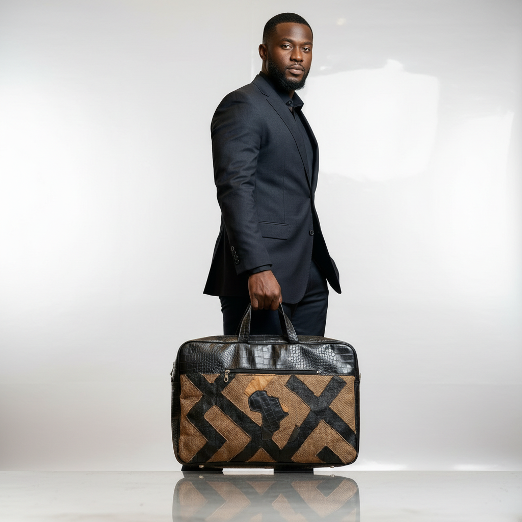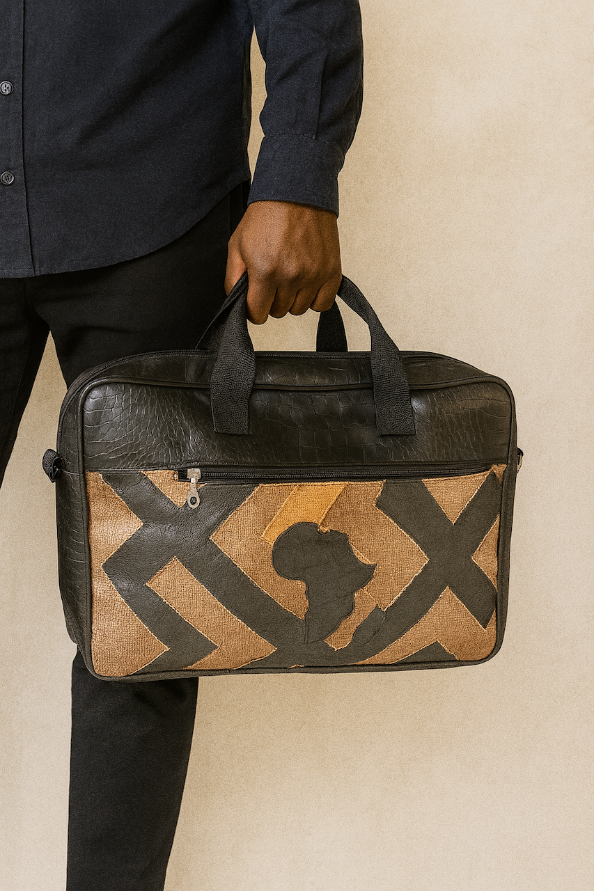 The geometric surface composition reflects structured African textile influence, integrated here within a contemporary travel format. A leather Africa-shaped applique introduces dimensional detailing without interrupting structural clarity.