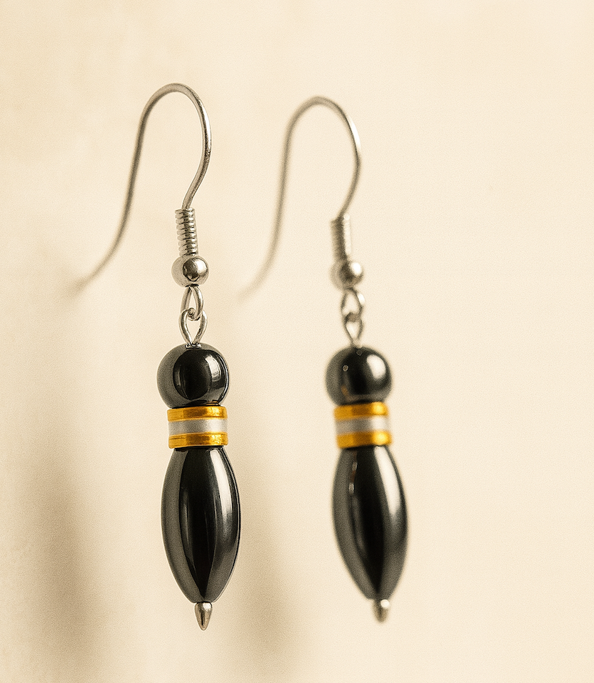 Elongated black onyx drop earrings featuring a polished oval lower stone, spherical upper bead, and structured gold-tone accent rings. The vertical composition creates refined contrast between deep gloss black and warm metallic detail.