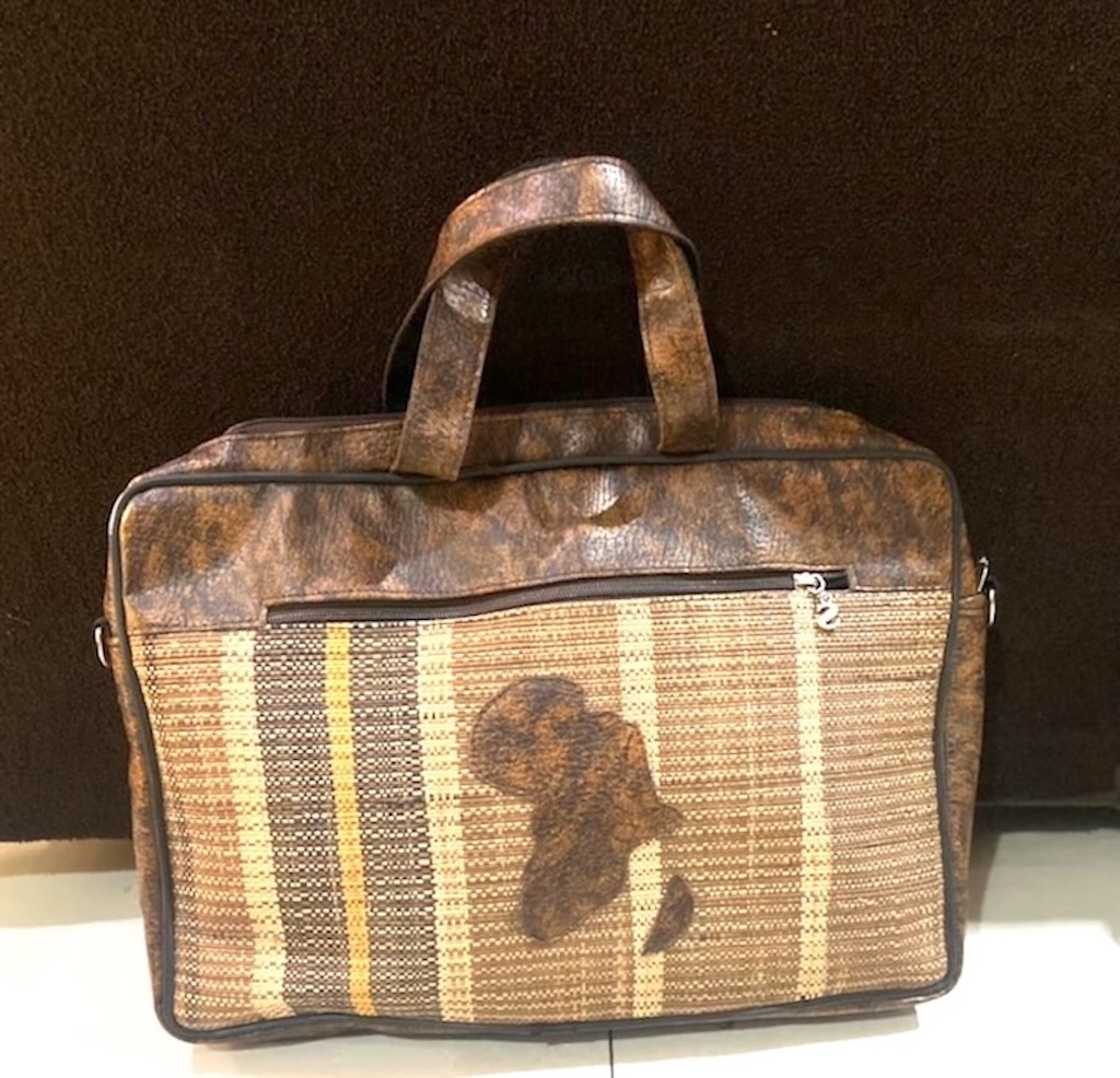 The woven raffia panel integrates vertical stripe composition, while a leather Africa-shaped applique introduces dimensional detail across the surface. The bag maintains a balanced horizontal proportion suitable for laptop and document transport.