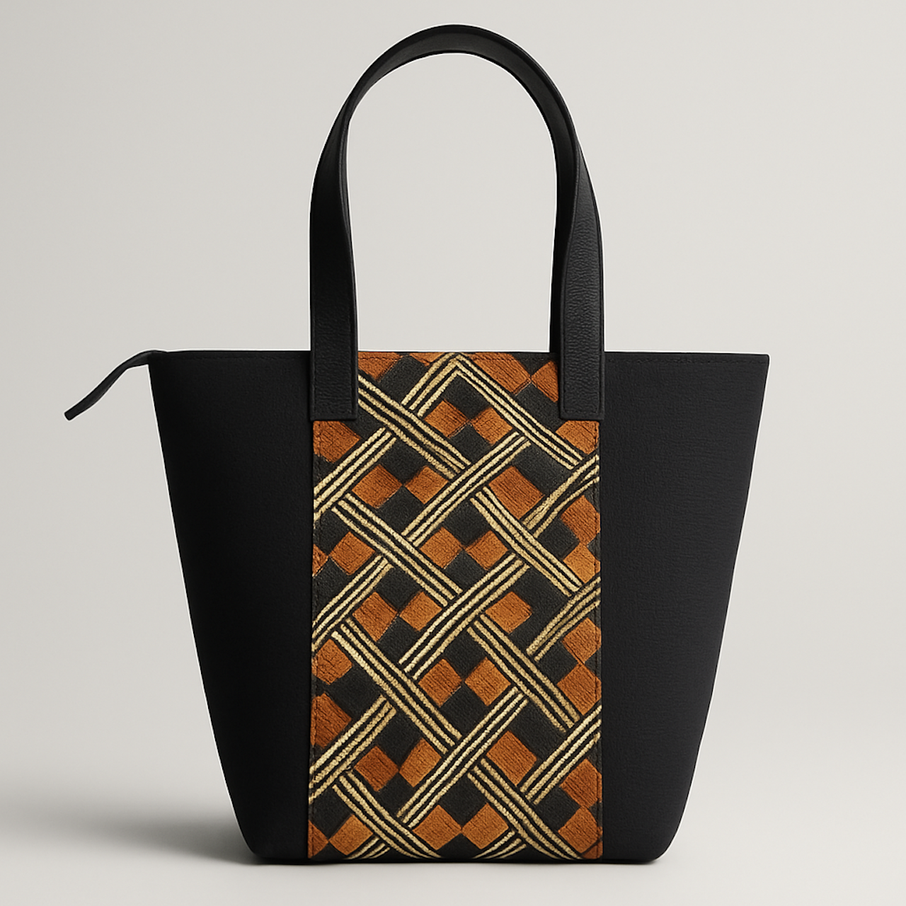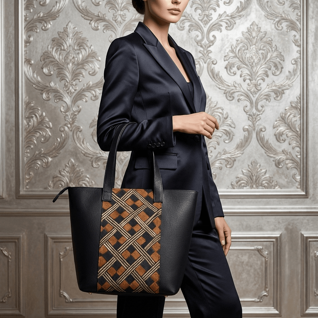 Leather side panels and extended shoulder straps provide structural reinforcement, stabilizing the open form while preserving clean proportional clarity. The central textile panel draws from Kuba raffia weaving traditions, where hand-cut fibers are dyed, stitched, and layered into geometric compositions that communicate lineage, rhythm, and measured symmetry. In this format, the woven surface functions as both material focal point and architectural anchor, integrating cultural textile structure within a contemporary carry silhouette.