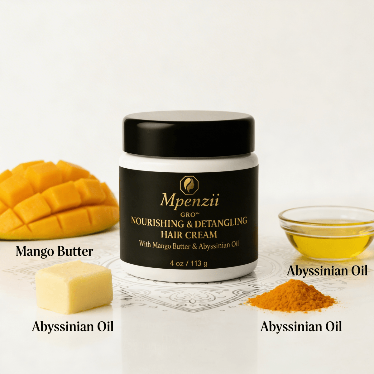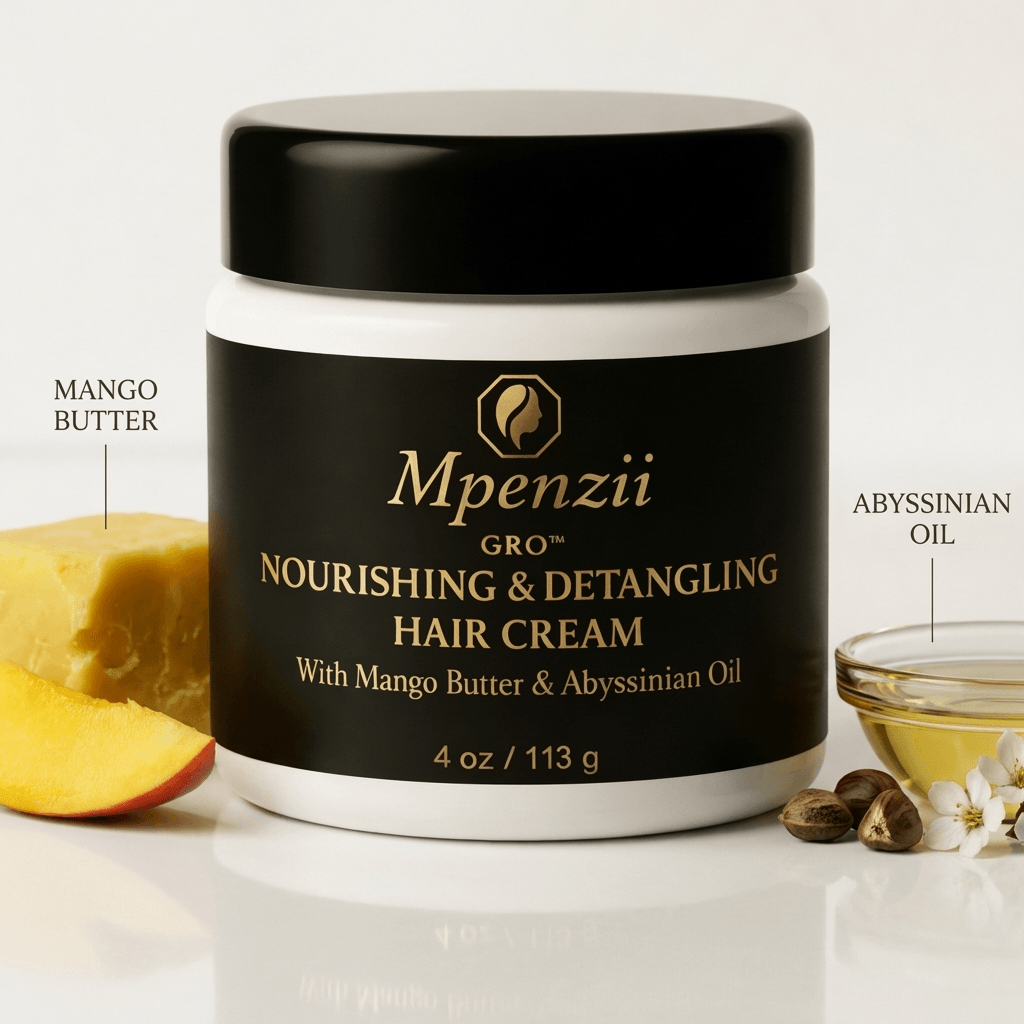 The cream is engineered to support detangling by reducing friction between strands, allowing hair to separate more easily without disruption. Mango butter provides the foundational structure, offering softness and moisture retention, while Abyssinian oil refines the finish, contributing to improved spreadability and a smoother surface feel.
