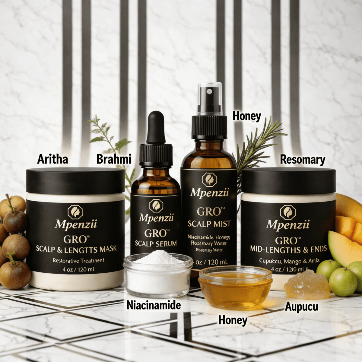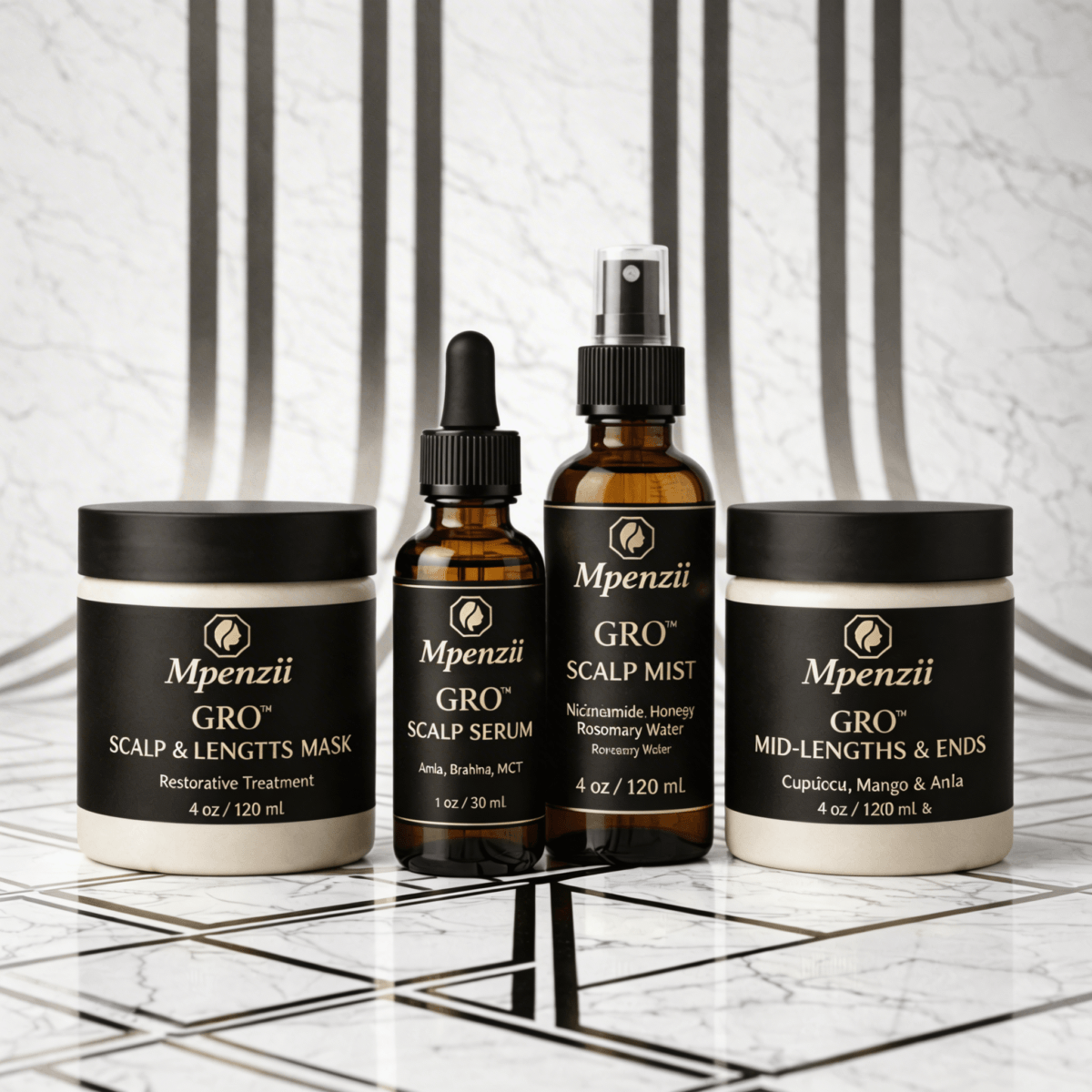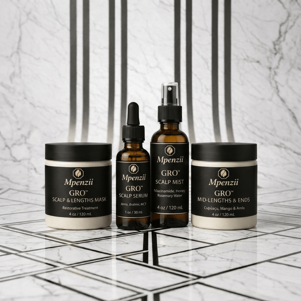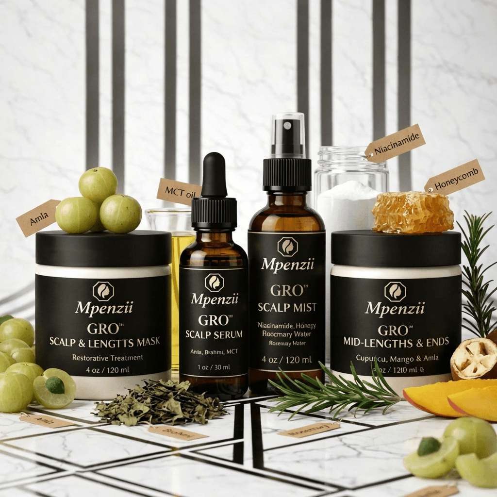 The MPENZII Ayurvedic GRO™ SYSTEM is structured as a four-step botanical regimen designed to support scalp conditioning and fibre reinforcement through layered formulation architecture. Each component is calibrated for a specific role: cleansing and preparation, infusion delivery, daily hydration, and structural sealing at the mid-lengths and ends.