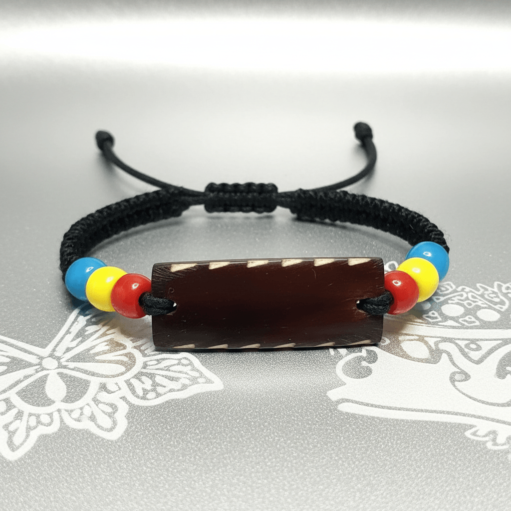 A structured composition of hand-carved cow bone and vibrant accent beads, assembled along a braided adjustable cord. The polished bone centrepiece introduces warmth and material depth, contrasted by bold color elements that create balance and presence.