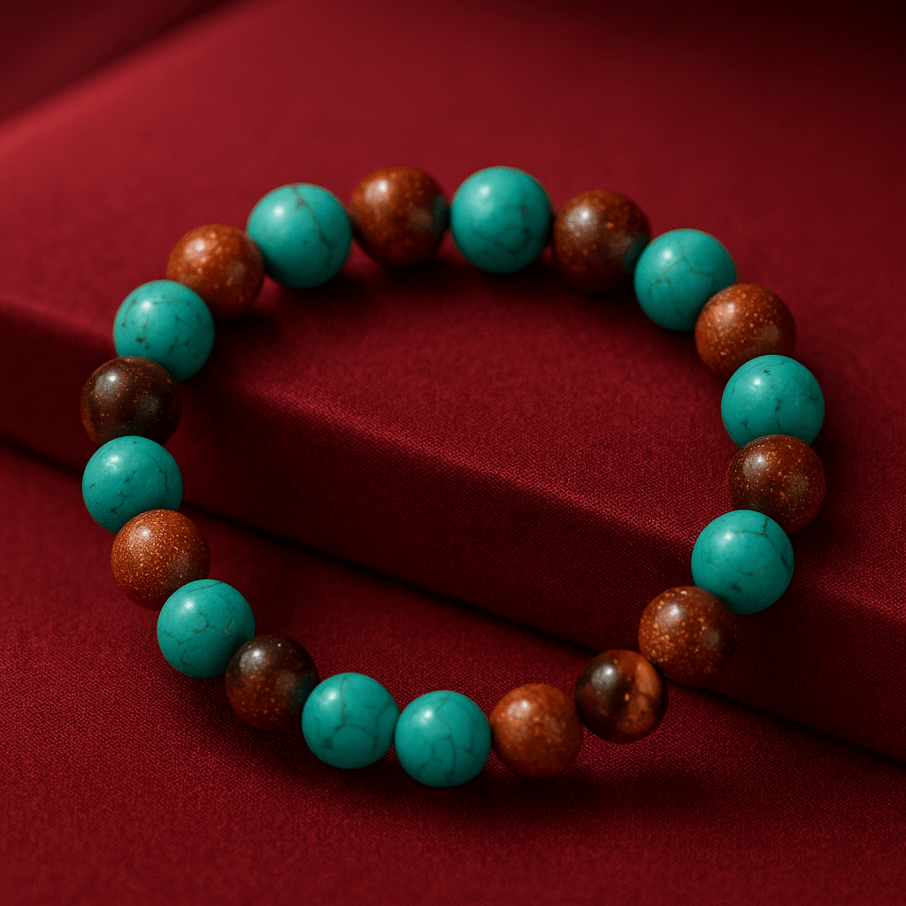 The turquoise introduces brightness and surface character, while the brown stones anchor the composition with warmth and depth. Designed for standalone wear or layered stacking, the bracelet maintains visual proportion across the wrist.