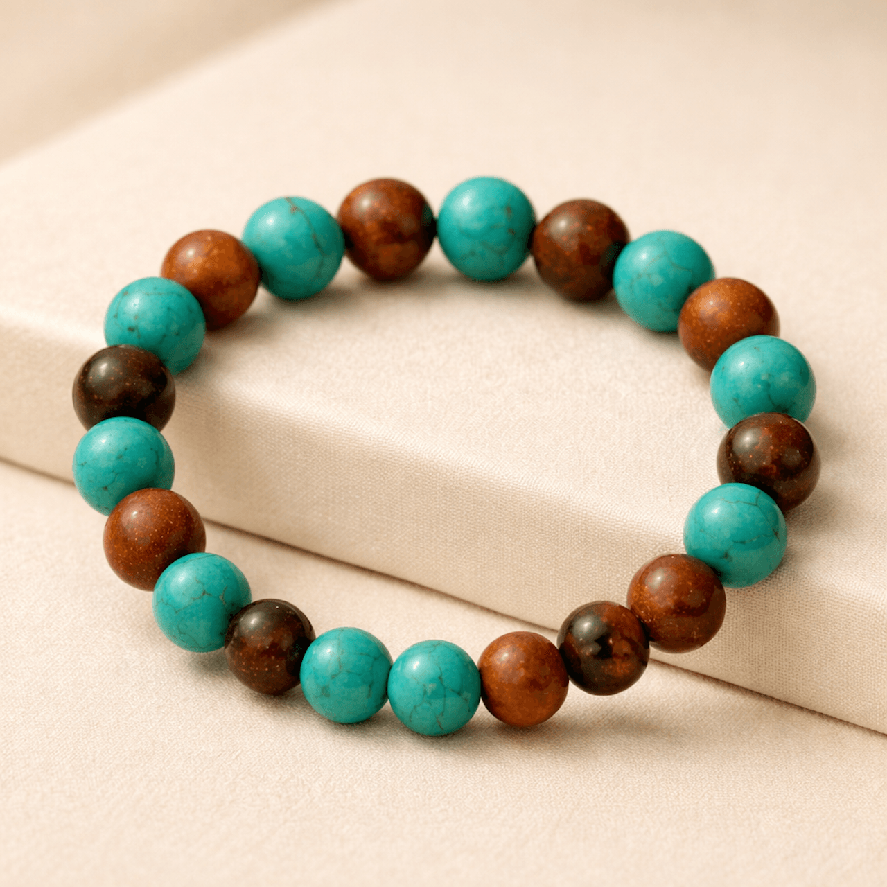 This two-tone bracelet alternates turquoise-toned round beads with deep brown natural stone spheres, creating a measured rhythm of cool mineral blue and grounded earth tones. The circular composition is intentionally uniform, allowing the material dialogue to carry the visual weight.