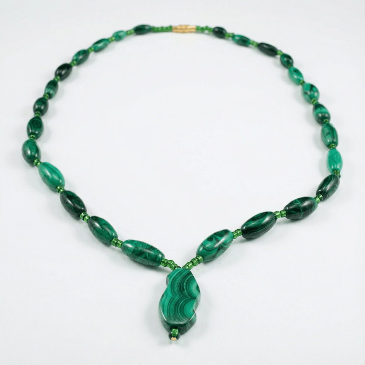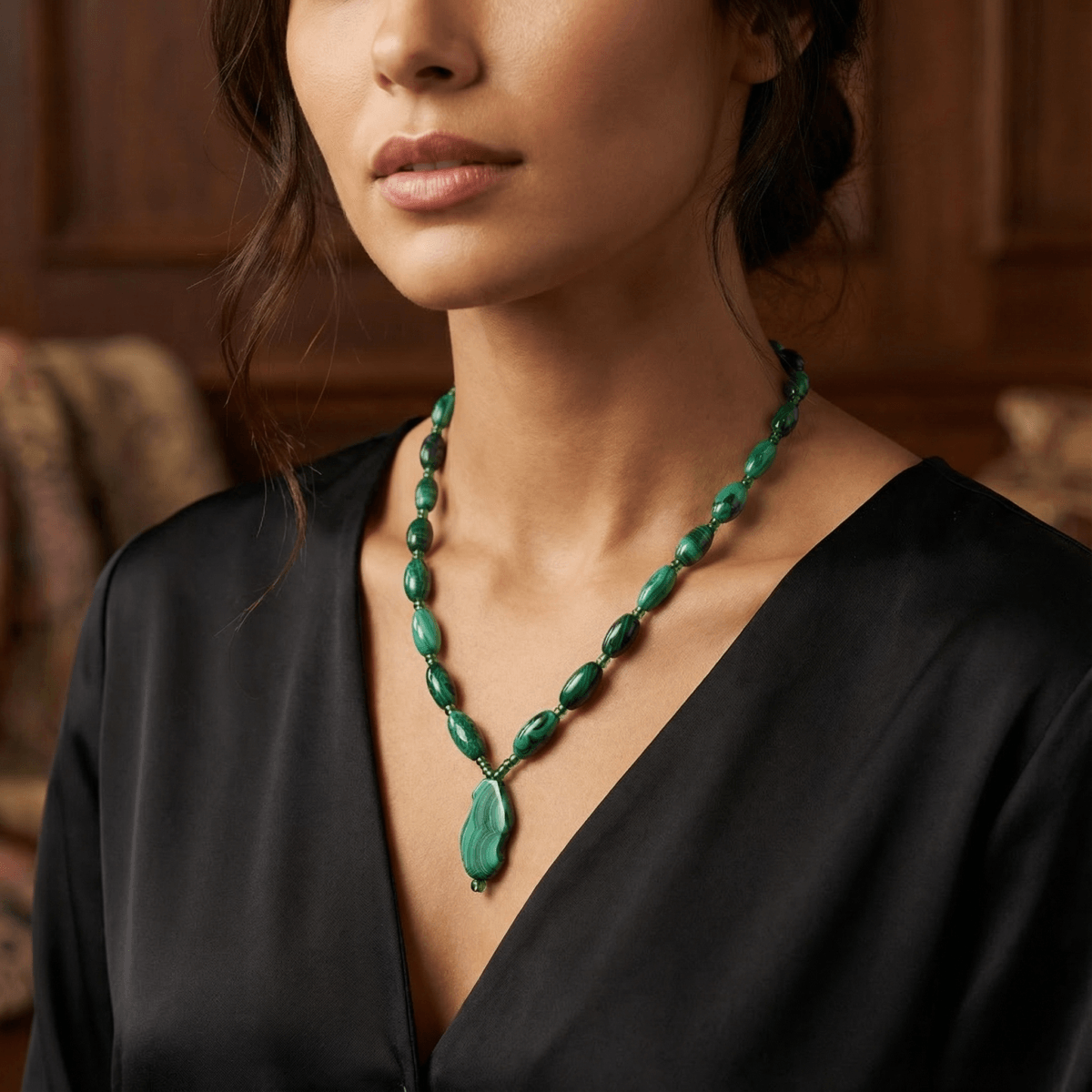 The banded depth of deep green malachite creates natural movement across each surface. Variations in striping and tonal density are inherent to the stone, giving each bead and pendant its own material identity while preserving overall balance and weight distribution.