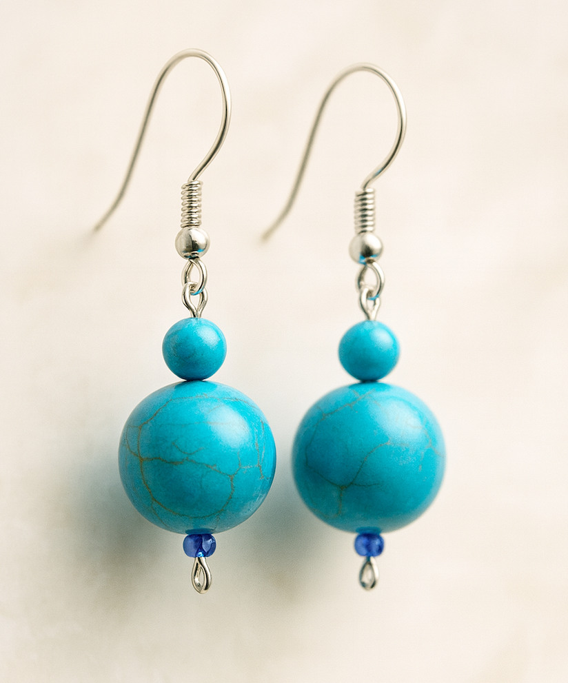 MPENZII earrings are composed through measured material selection and proportion control. Each bead is aligned for vertical symmetry and weight balance, allowing subtle natural variation in the turquoise surface while preserving structural clarity and long-term wear stability.