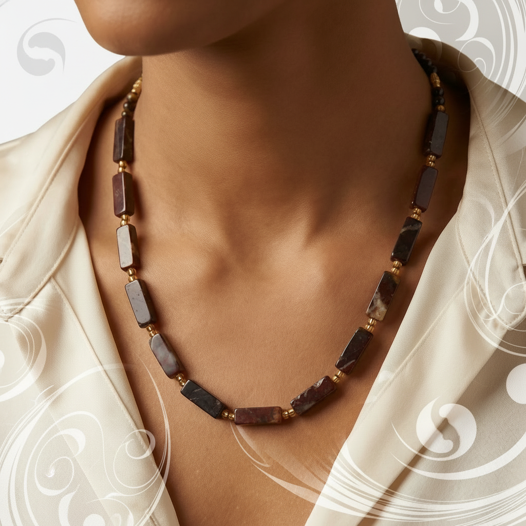 Rectangular jasper segments form a deliberate linear sequence along the neckline, separated by warm metallic spacers that introduce measured contrast. The geometry remains restrained and architectural, allowing the stone’s natural patterning to carry the visual weight of the piece.