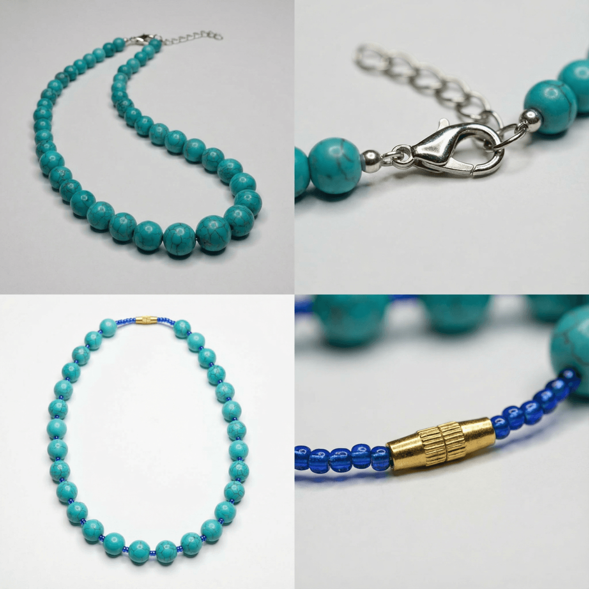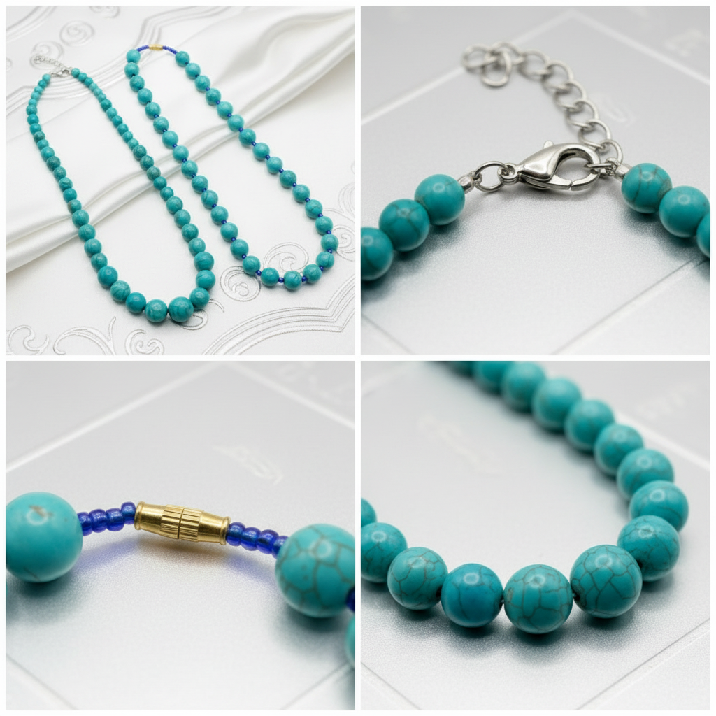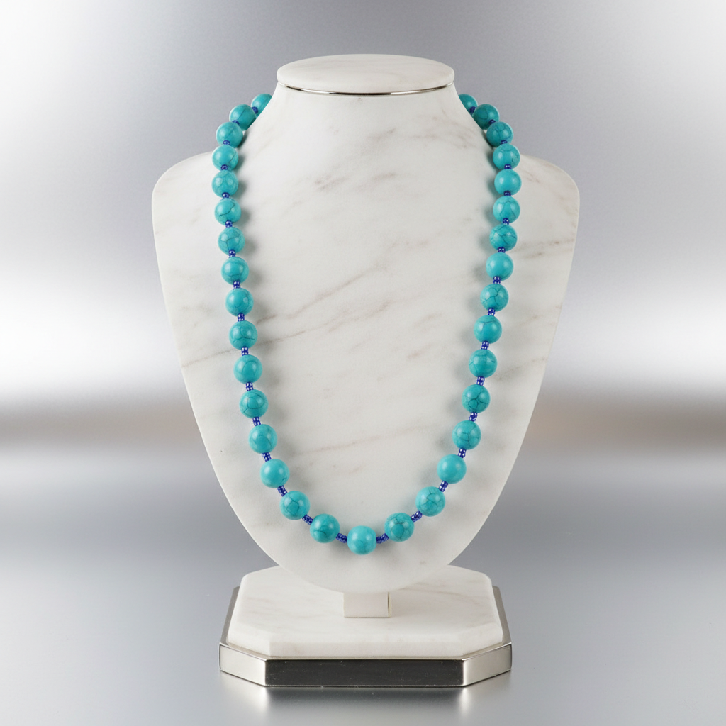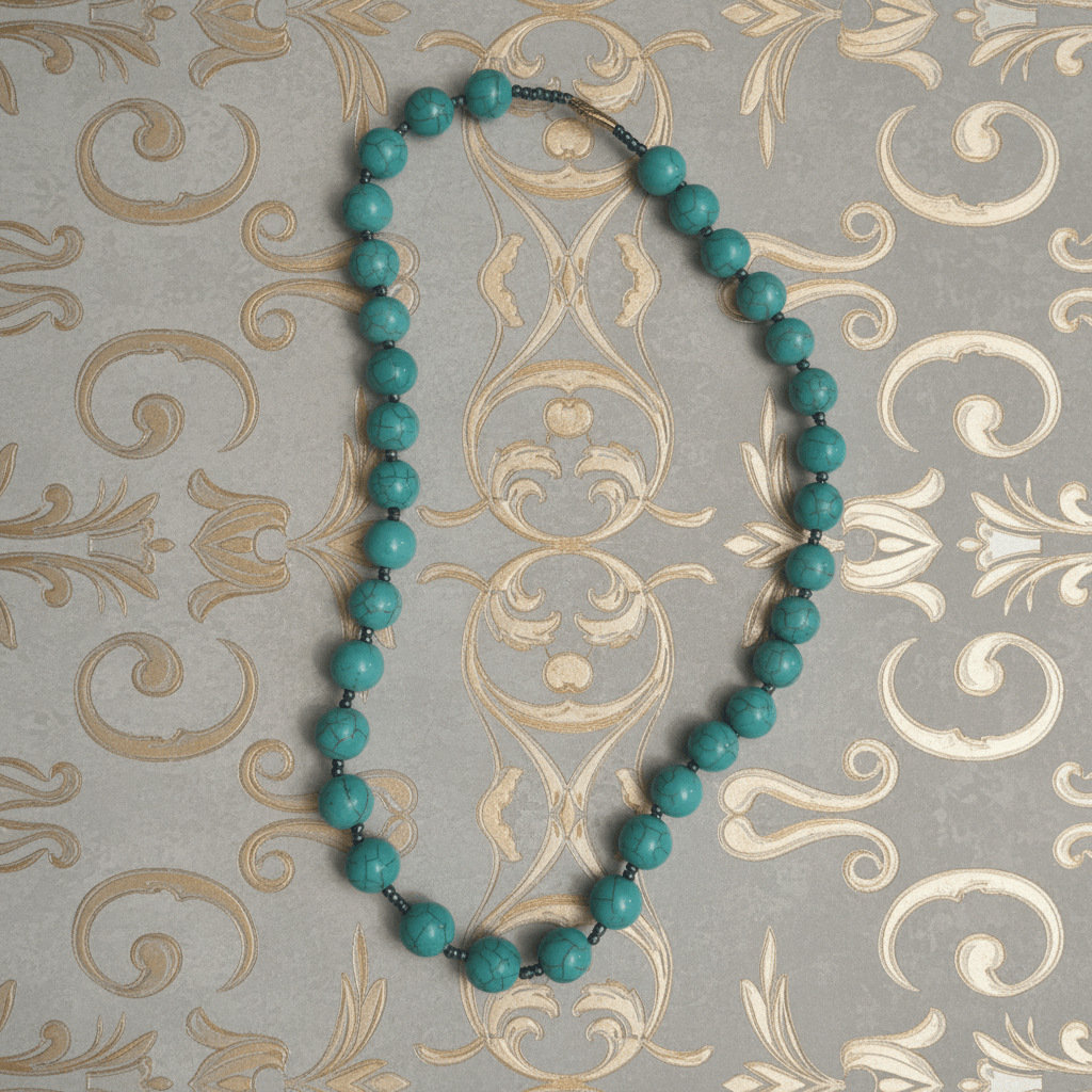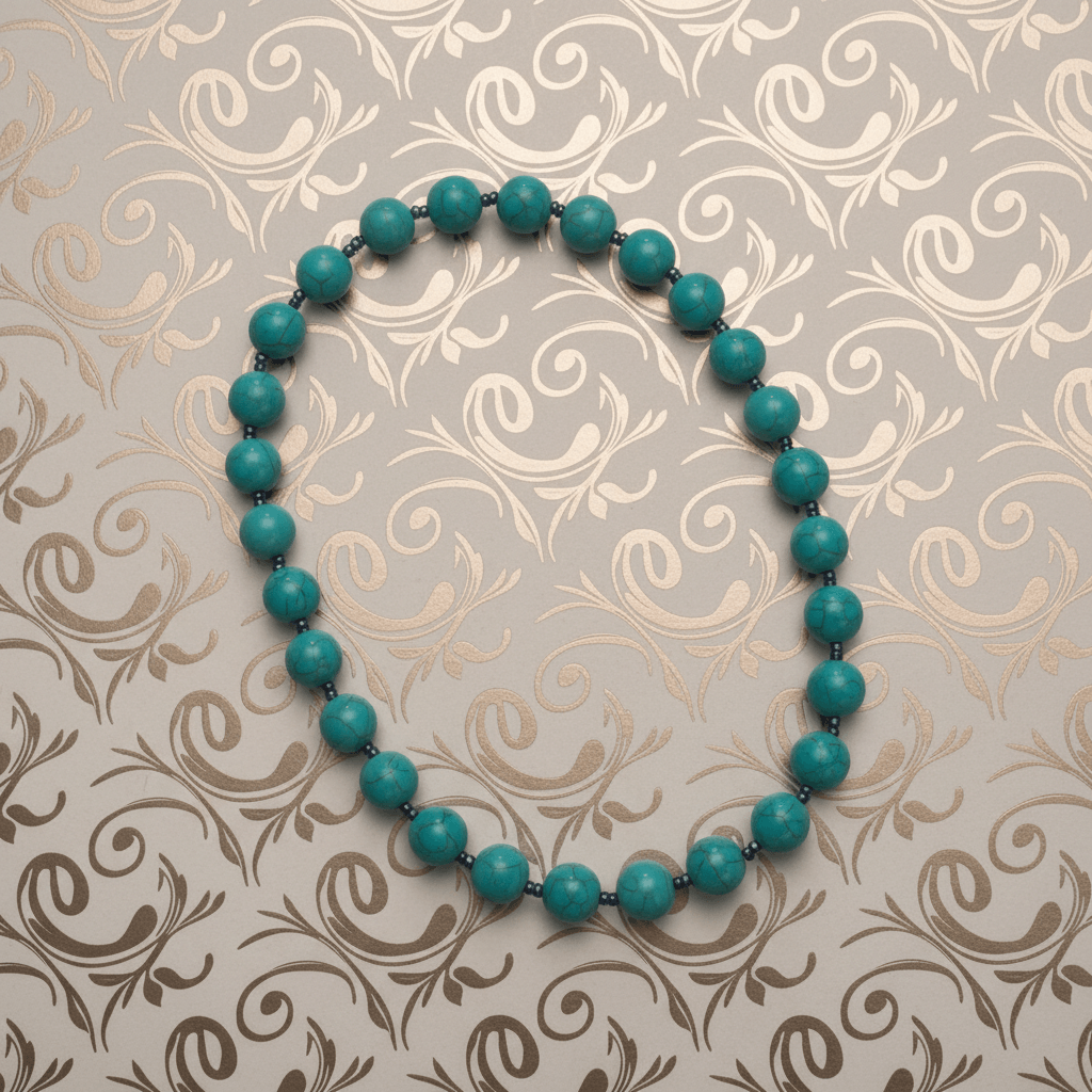 The vibrant blue-green tone introduces clarity and brightness without excess ornamentation. Subtle surface matrix variations within each bead create dimensional character, allowing the material itself to define the structure.