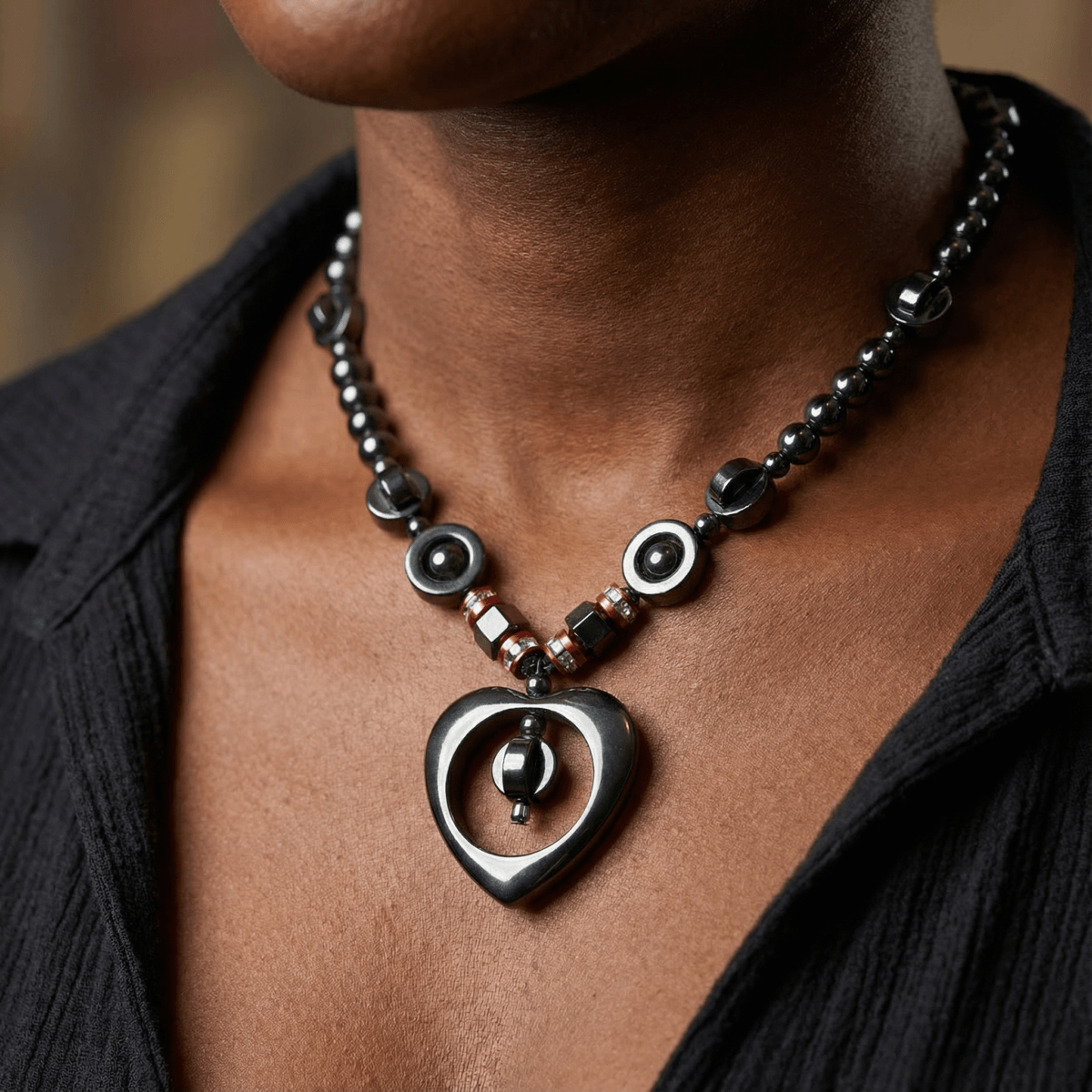 A sculpted heart form anchors this hematite necklace, suspended from a sequence of finely polished metallic black beads arranged in measured progression. The composition transitions from uniform rounds to structured cylindrical and faceted accents, introducing controlled variation while maintaining tonal continuity.