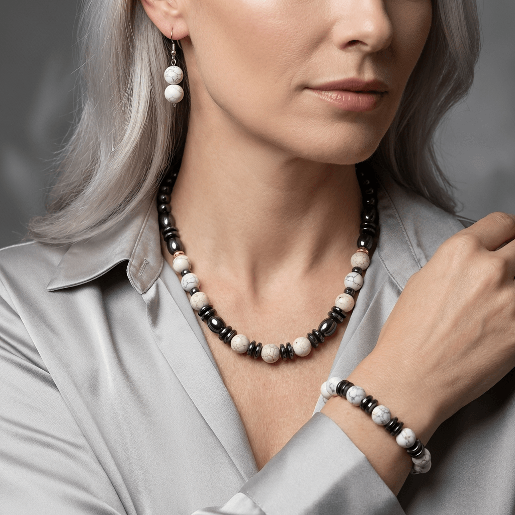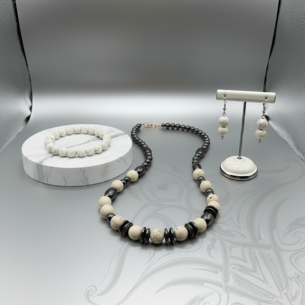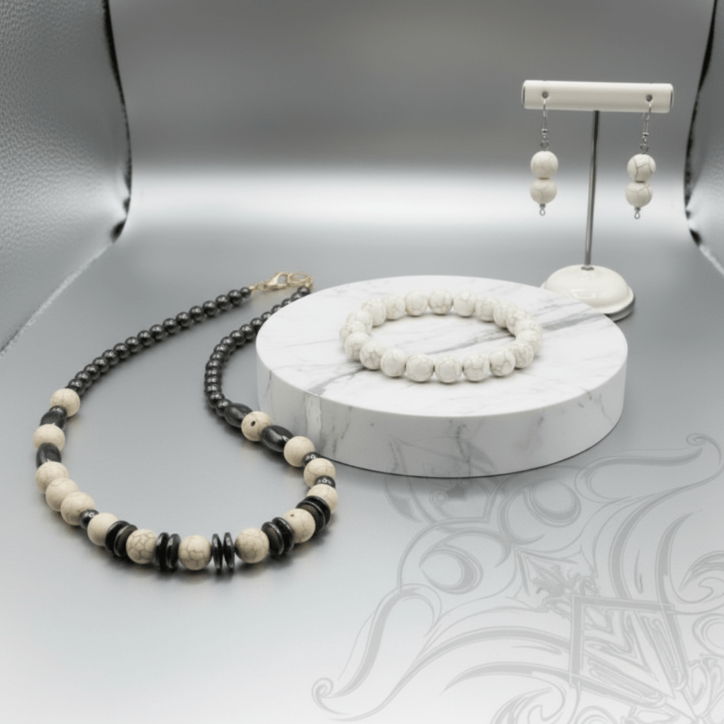 This composition brings together the dense, reflective depth of hematite with the soft, mineral surface of white turquoise (howlite). The interplay between dark metallic tones and pale stone creates a measured rhythm, where each element is placed with intention rather than repetition.