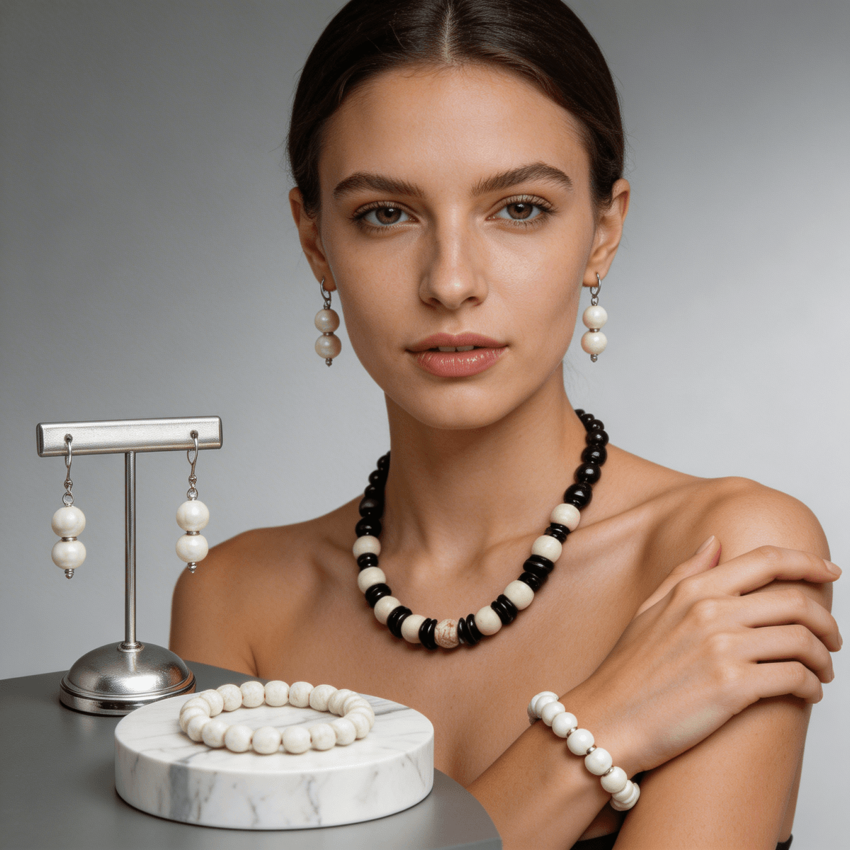 The necklace follows a structured line along the neckline, defined by controlled spacing and material contrast. Paired with a stretch bracelet and coordinated drop earrings, the set maintains continuity without excess—refined, composed, and materially focused.