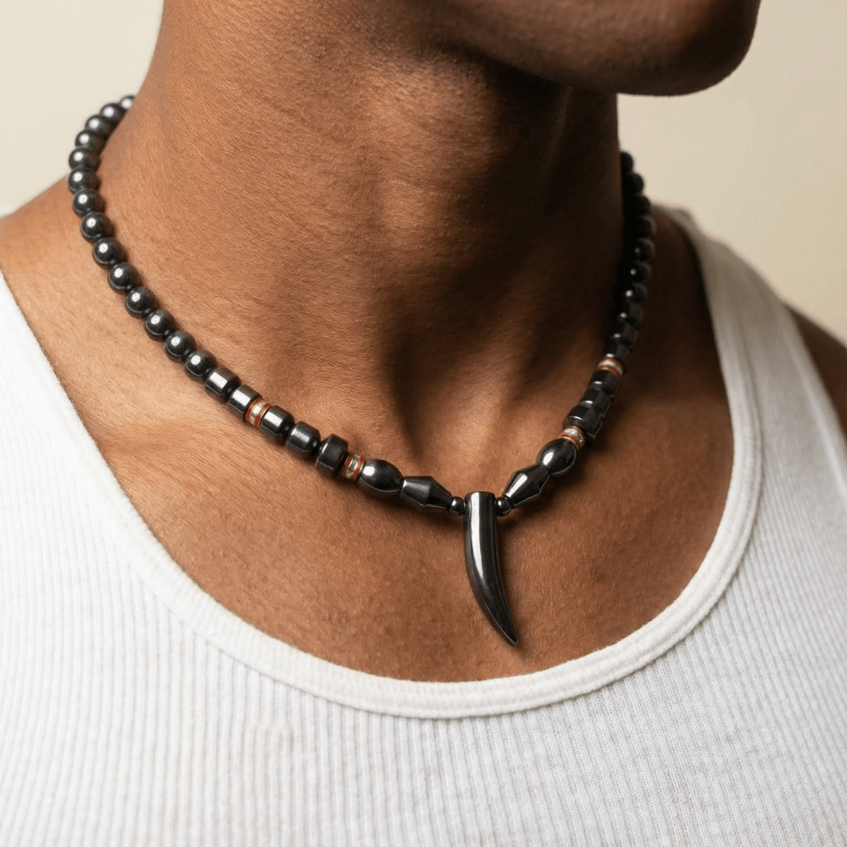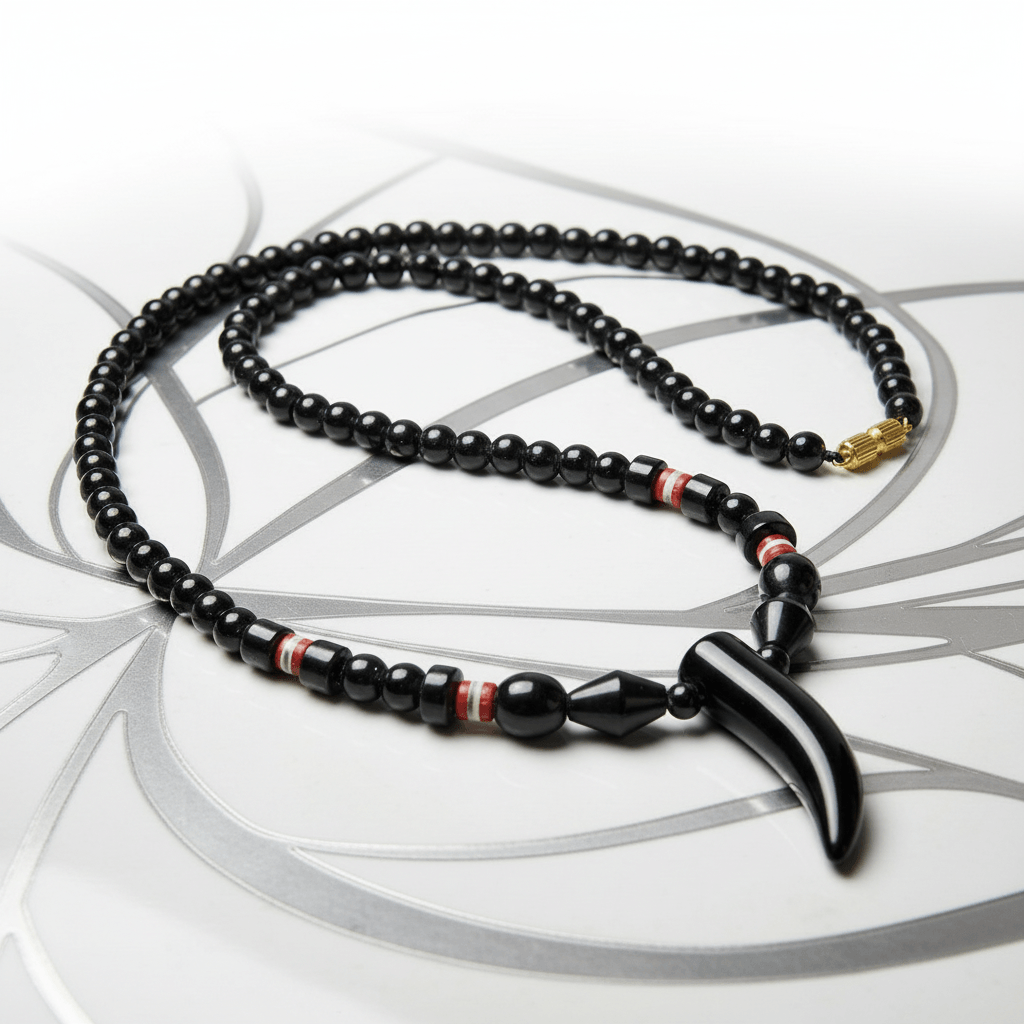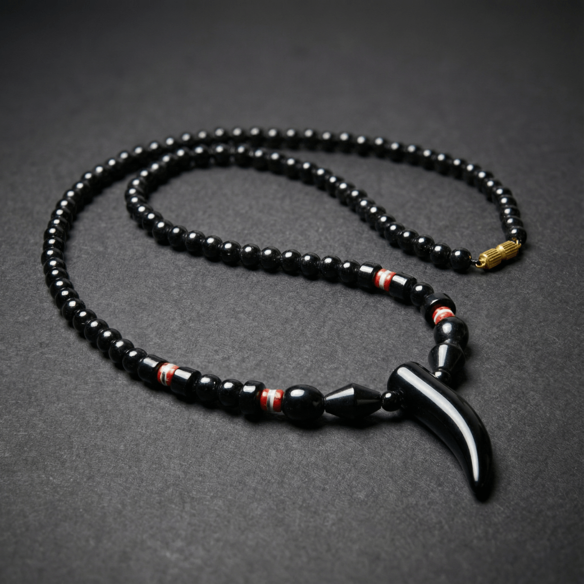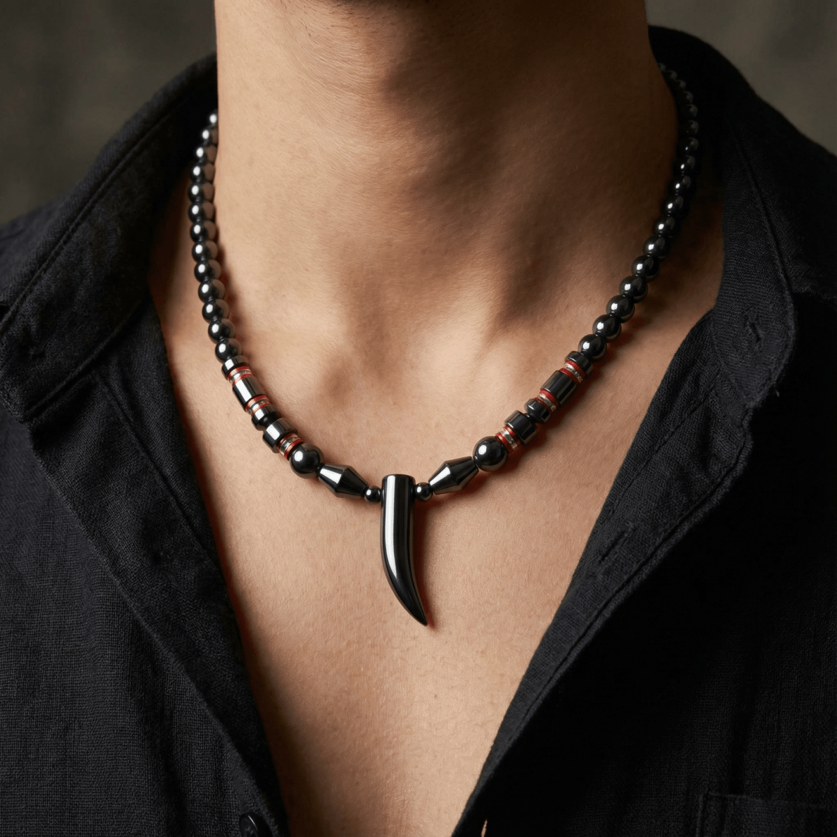 A curved horn silhouette anchors this hematite necklace, suspended from a sequence of finely polished black beads that create uninterrupted tonal depth along the neckline. Subtle cylindrical accents with red band detailing introduce controlled contrast, reinforcing the linear structure without disrupting compositional balance.