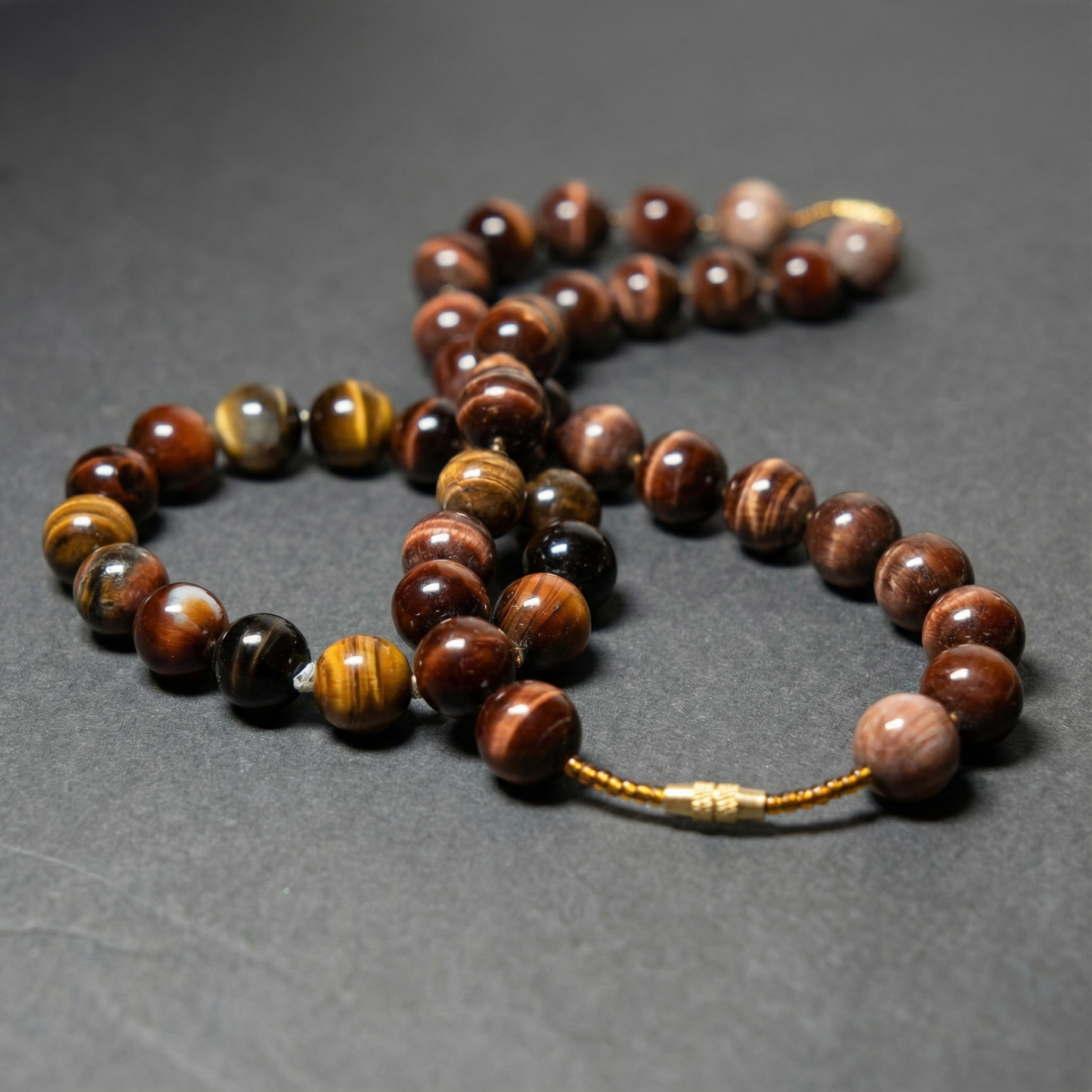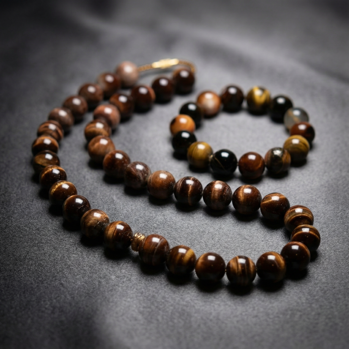 Defined by warmth and tonal movement, this set is composed around tiger’s eye stones with layered bands of brown, amber, and deep gold. As light shifts across the surface, subtle chatoyancy emerges, giving the beads a quiet sense of depth.