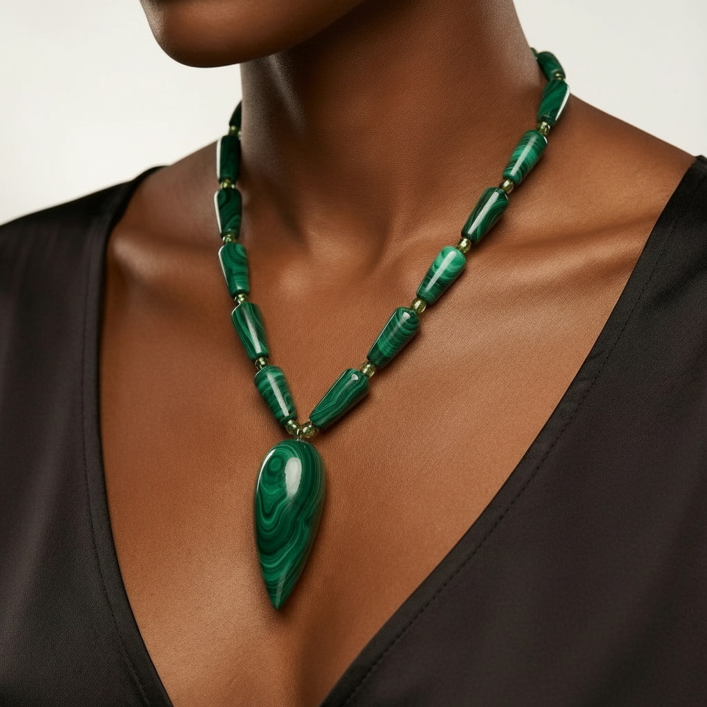 A structured composition of elongated malachite barrel beads transitions into a sculpted tapered drop pendant, forming a centered vertical line that anchors the neckline with clarity and restraint.