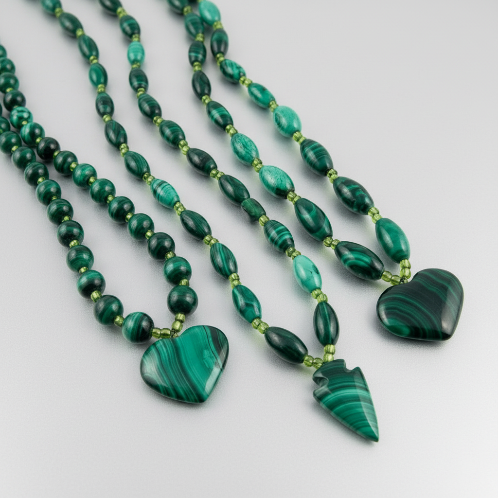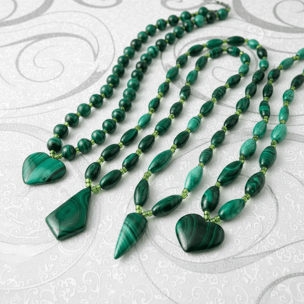 A structured composition of elongated malachite barrel beads transitions into a sculpted tapered drop pendant, forming a centred vertical line that anchors the neckline with clarity and restraint.