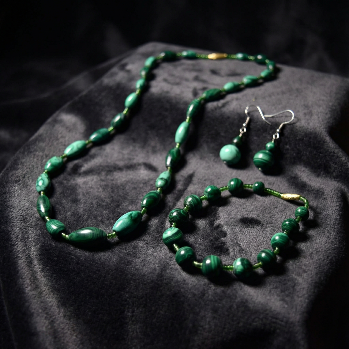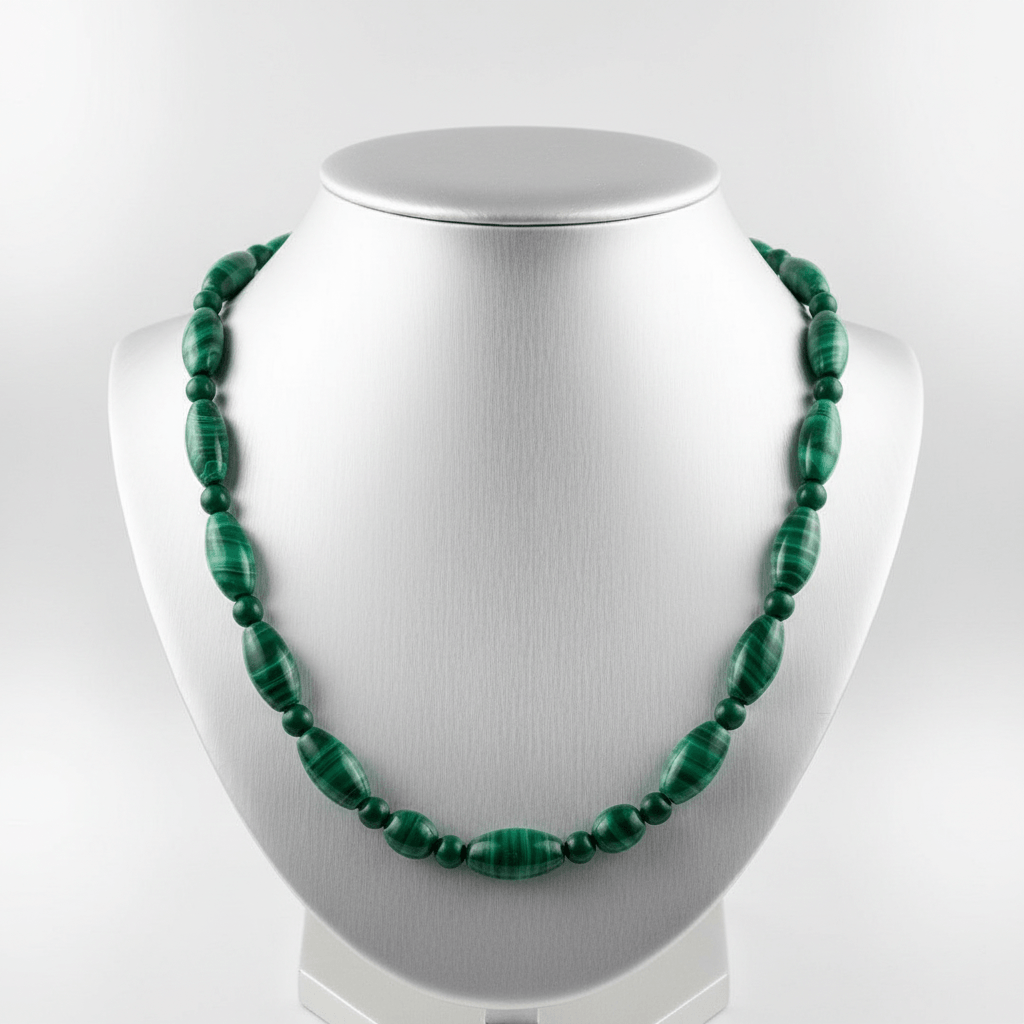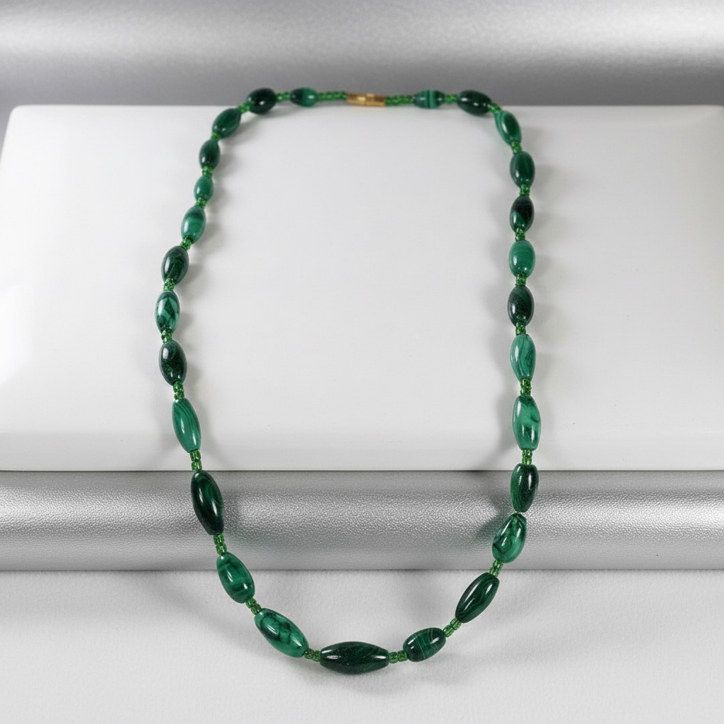 A structured composition of elongated deep green malachite beads, anchored by a polished focal stone. The oval bead sequence establishes controlled rhythm along the neckline, while small spacer transitions preserve proportion and visual continuity.
