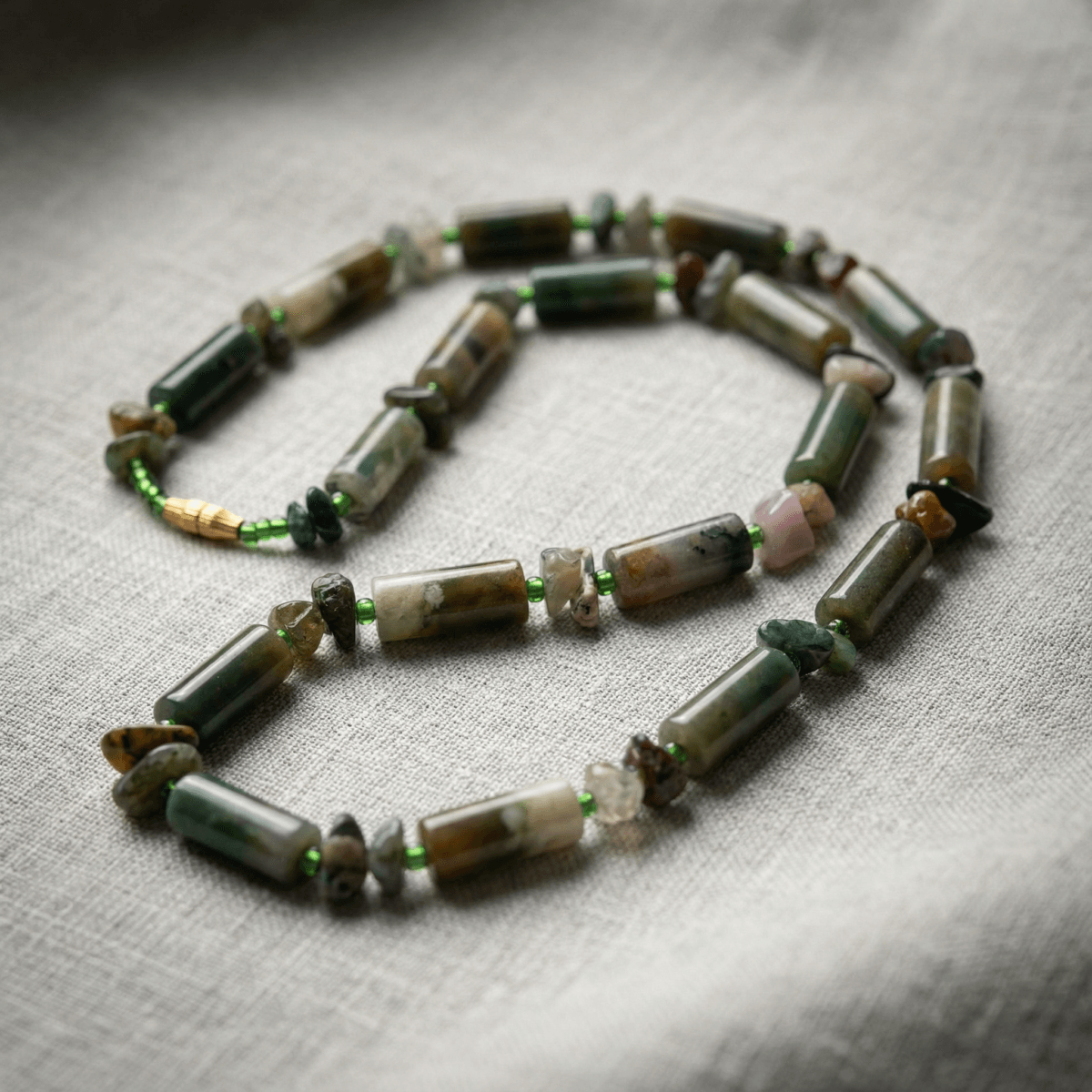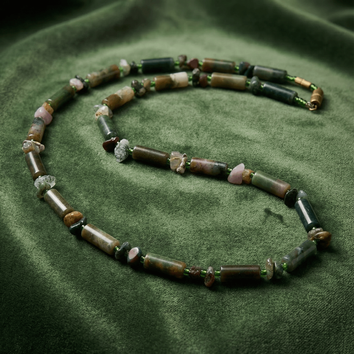 This earth-tone multi-stone cylindrical beaded necklace features polished green and natural jasper segments with organic chip accents; tonal variations occur due to handcrafted stone composition.