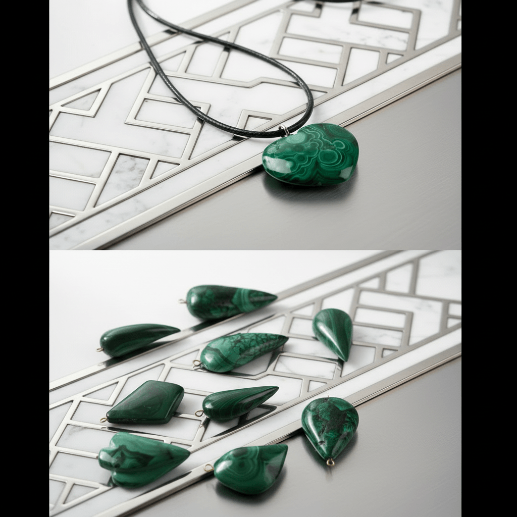 A single polished malachite stone anchors this composition in restrained simplicity. The freeform cut preserves the natural banding structure — concentric mineral rings and layered tonal movement unique to malachite.