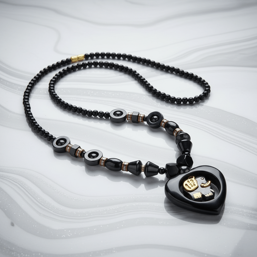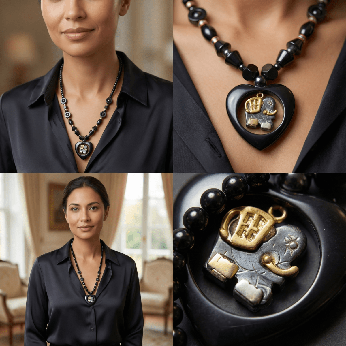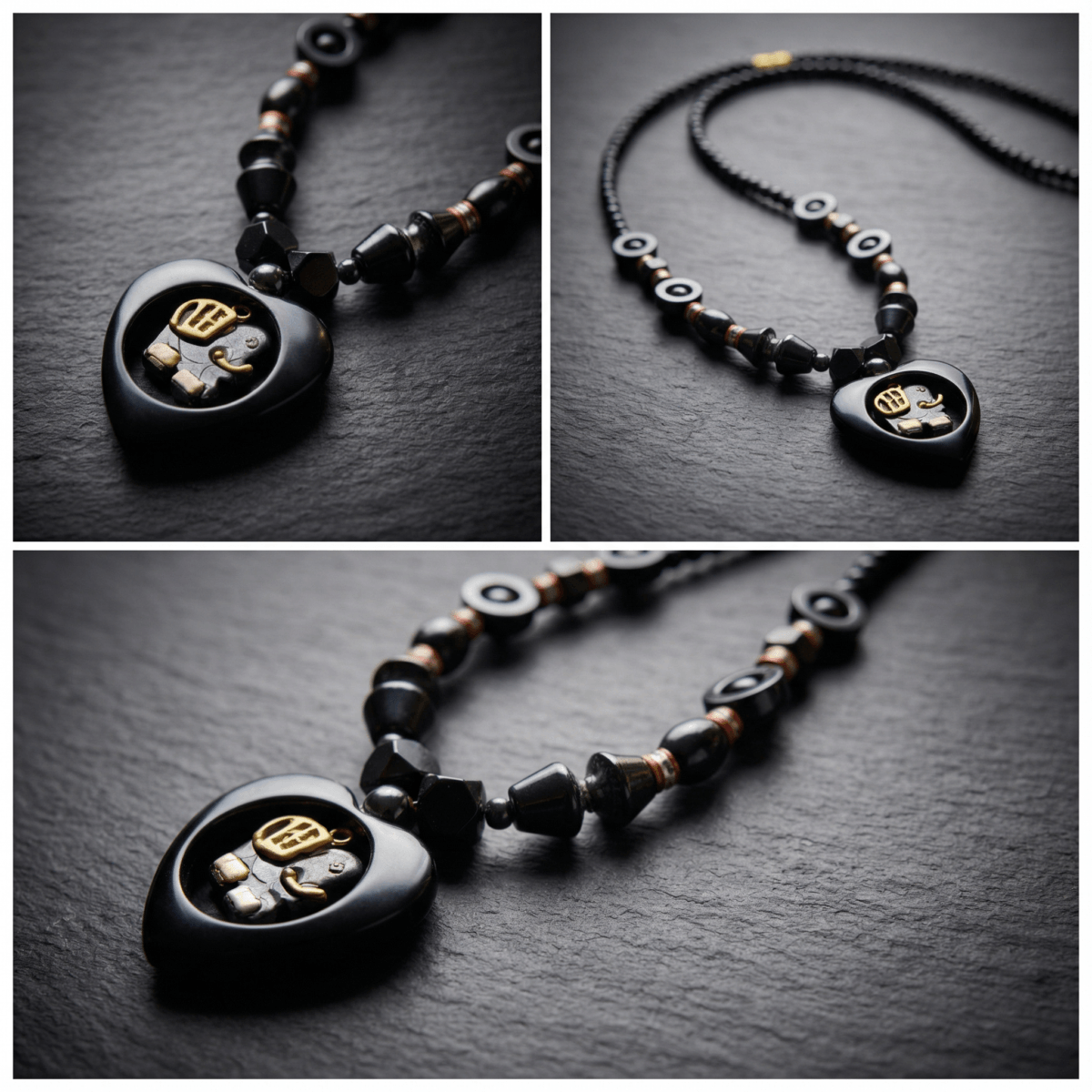 At the center, a sculpted black heart pendant frames an integrated elephant motif in gold tone — introducing symbolic depth within a controlled architectural form.