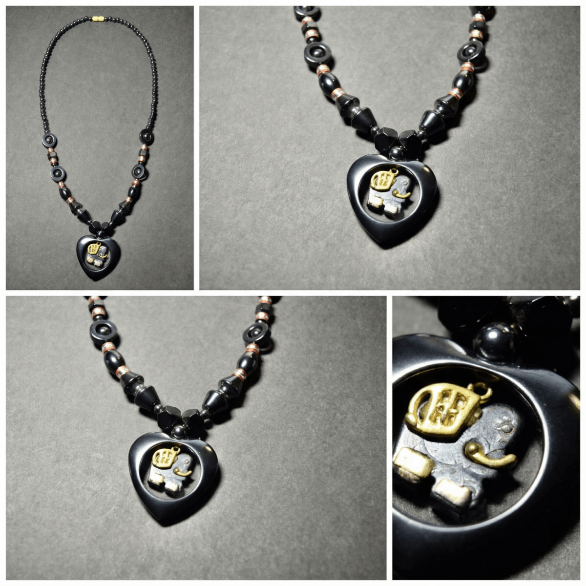 Deep Black Hematite & Elephant Heart Pendant Necklace