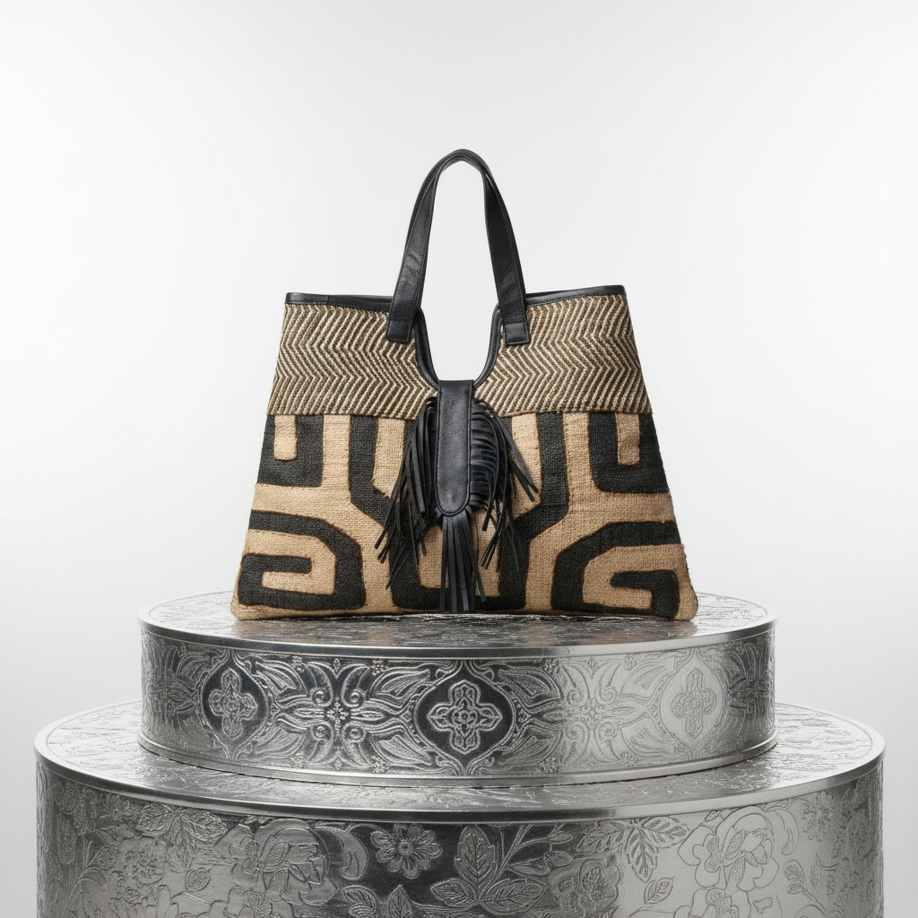 The graphic Kuba motif functions as both visual rhythm and material anchor, creating depth through tonal contrast and woven texture. A central leather tassel element introduces dimensional balance, softening the architectural lines while maintaining proportional clarity.