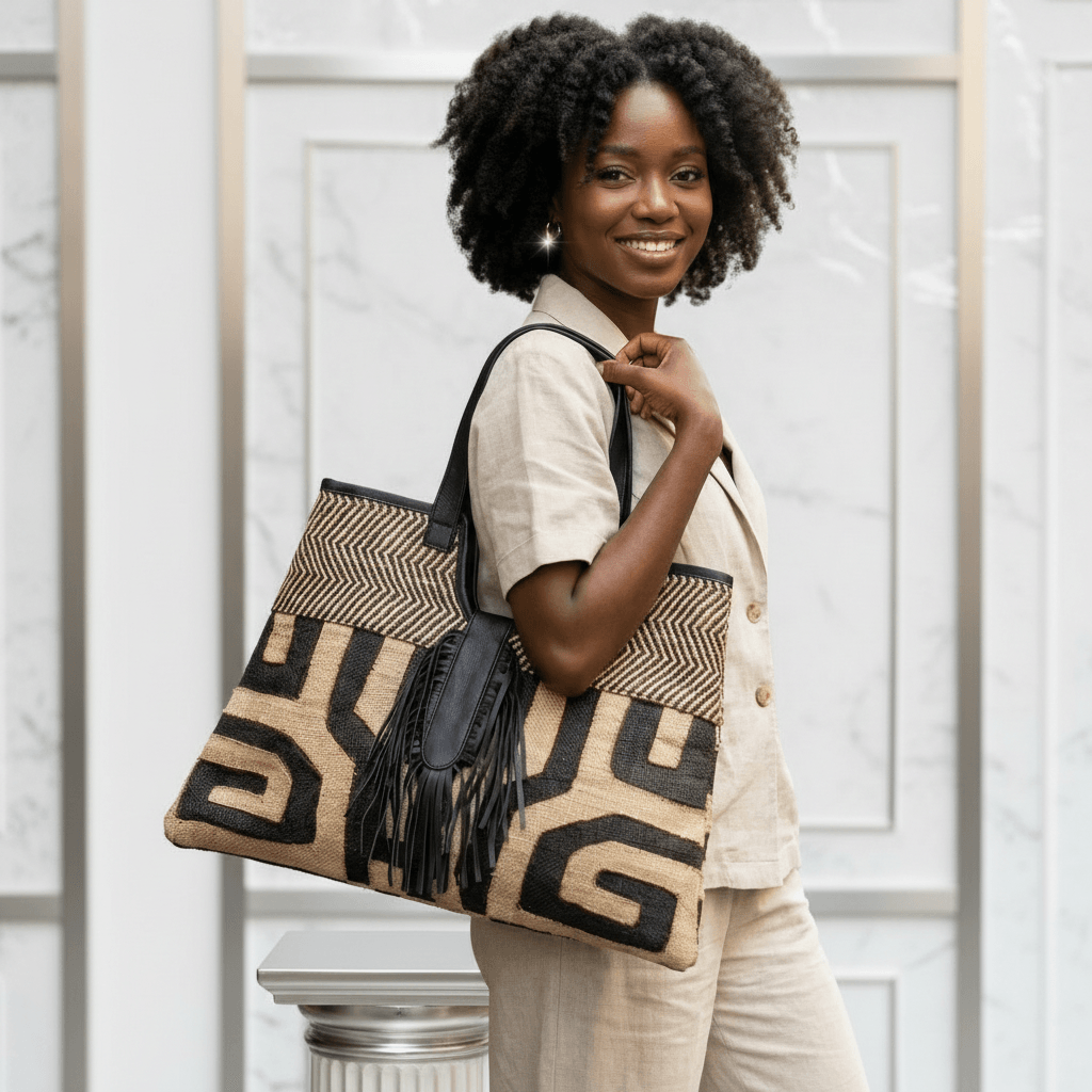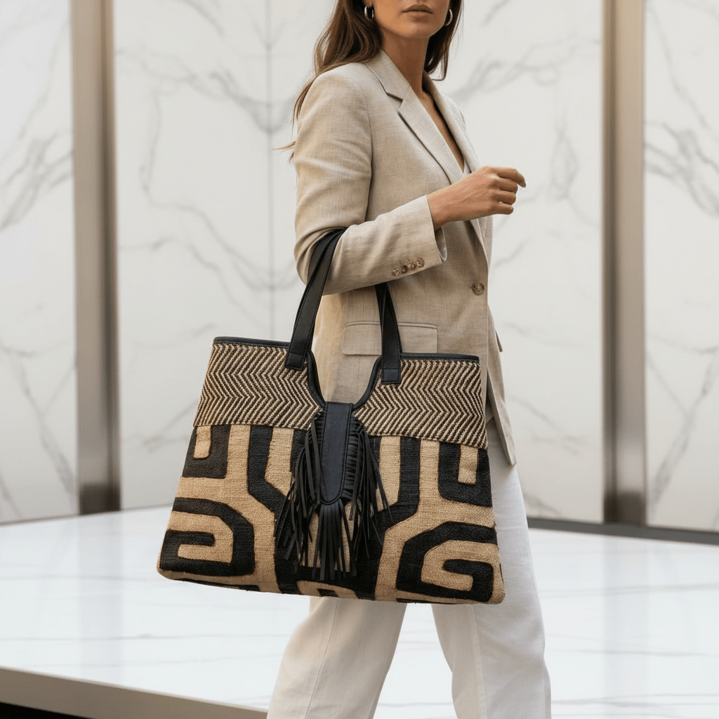 A structured carry silhouette anchored by bold Kuba textile geometry and disciplined raffia weave composition. The surface presents a controlled interplay of linear movement and directional patterning, framed by reinforced leather handles and vertical structural panels.