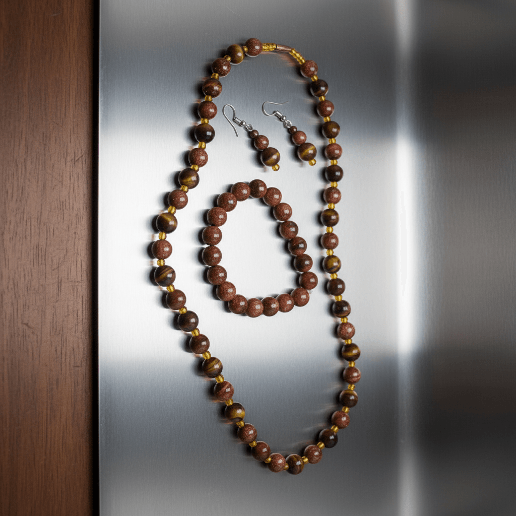 Mineral contrast anchors this three-piece jewelry set, where warm goldstone meets the layered banding of tiger’s eye in a balanced, graduated composition.