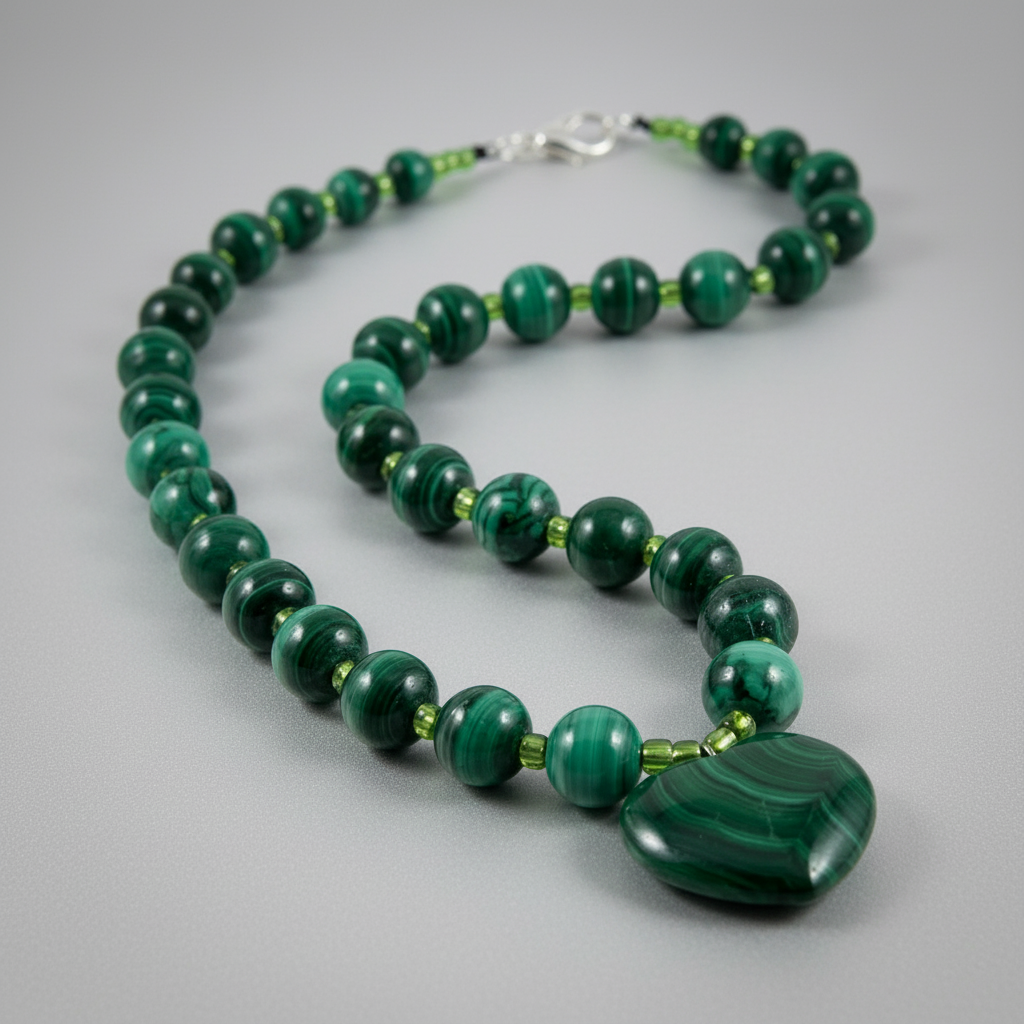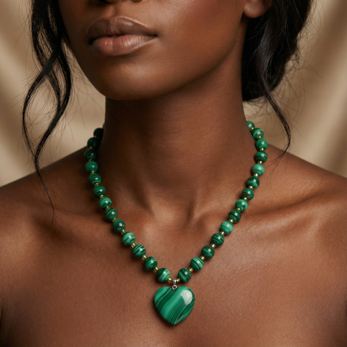 This deep green malachite heart beaded gemstone necklace features polished natural malachite beads and a centred heart pendant; slight variations in tone, banding, and surface may occur due to its handcrafted construction and natural stone origin.