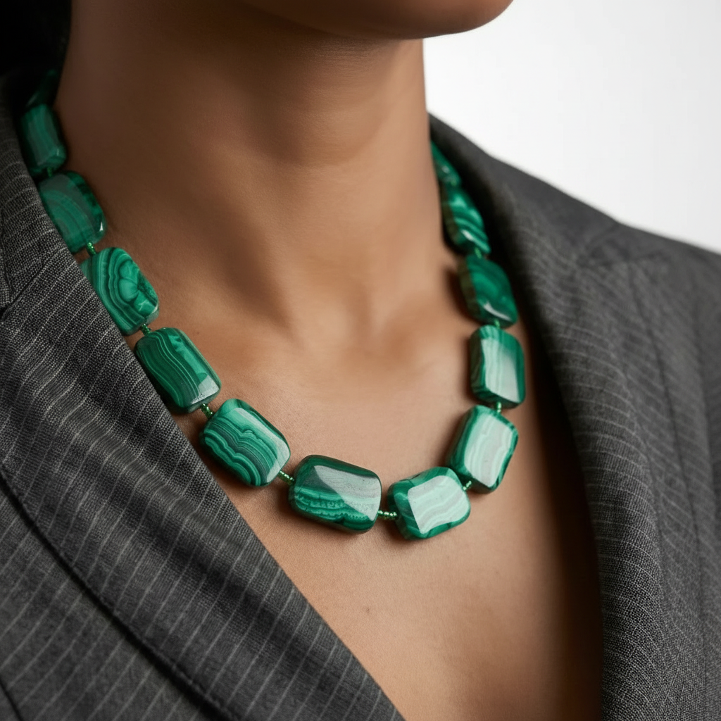 Bold rectangular malachite segments define this structured composition, arranged in measured spacing to create visual rhythm across the neckline. Each stone reveals layered green banding — concentric lines that move from deep forest to lighter emerald tones, forming natural internal landscapes within every polished surface.