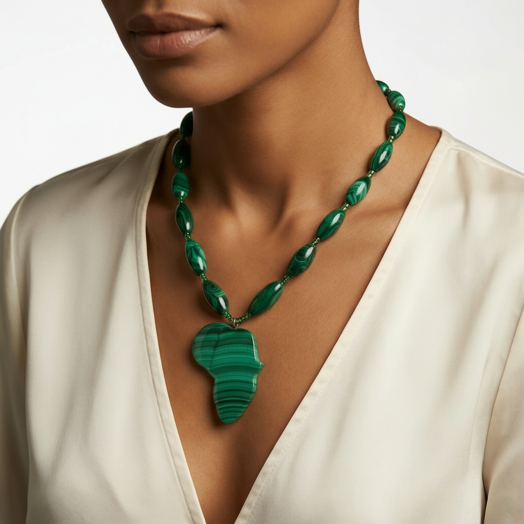 A sequence of polished oval malachite beads leads toward a carved Africa-shaped pendant, creating a measured descent along the neckline. The composition transitions from elongated forms into a defined continental silhouette, maintaining visual balance through controlled spacing and proportion.