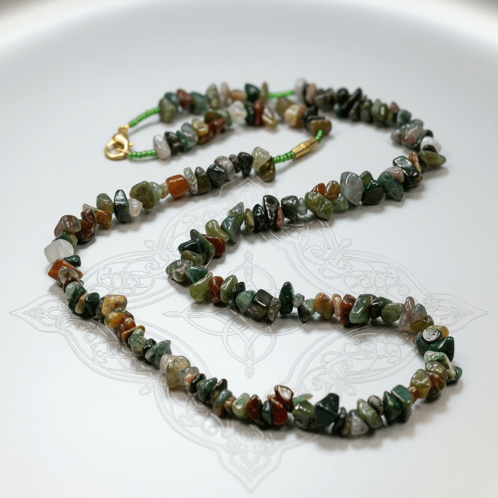 This multi-tone natural stone chip beaded necklace features irregular green, rust, and earth-toned mineral fragments; slight variations in color, shape, and surface may occur due to its handcrafted construction.