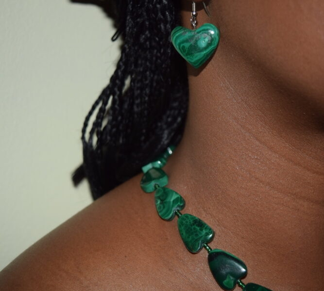 Design: A continuous sequence of sculpted heart forms creates a soft yet structured silhouette. The repetition of shape introduces rhythm while allowing the natural patterns of malachite to remain the focal point.