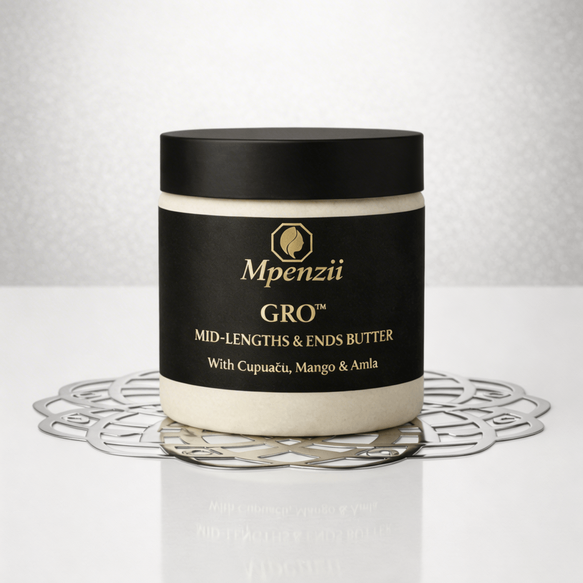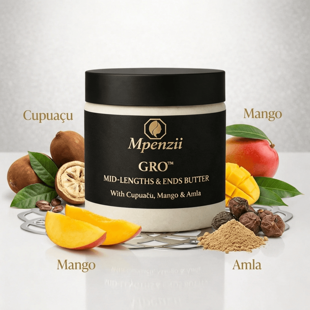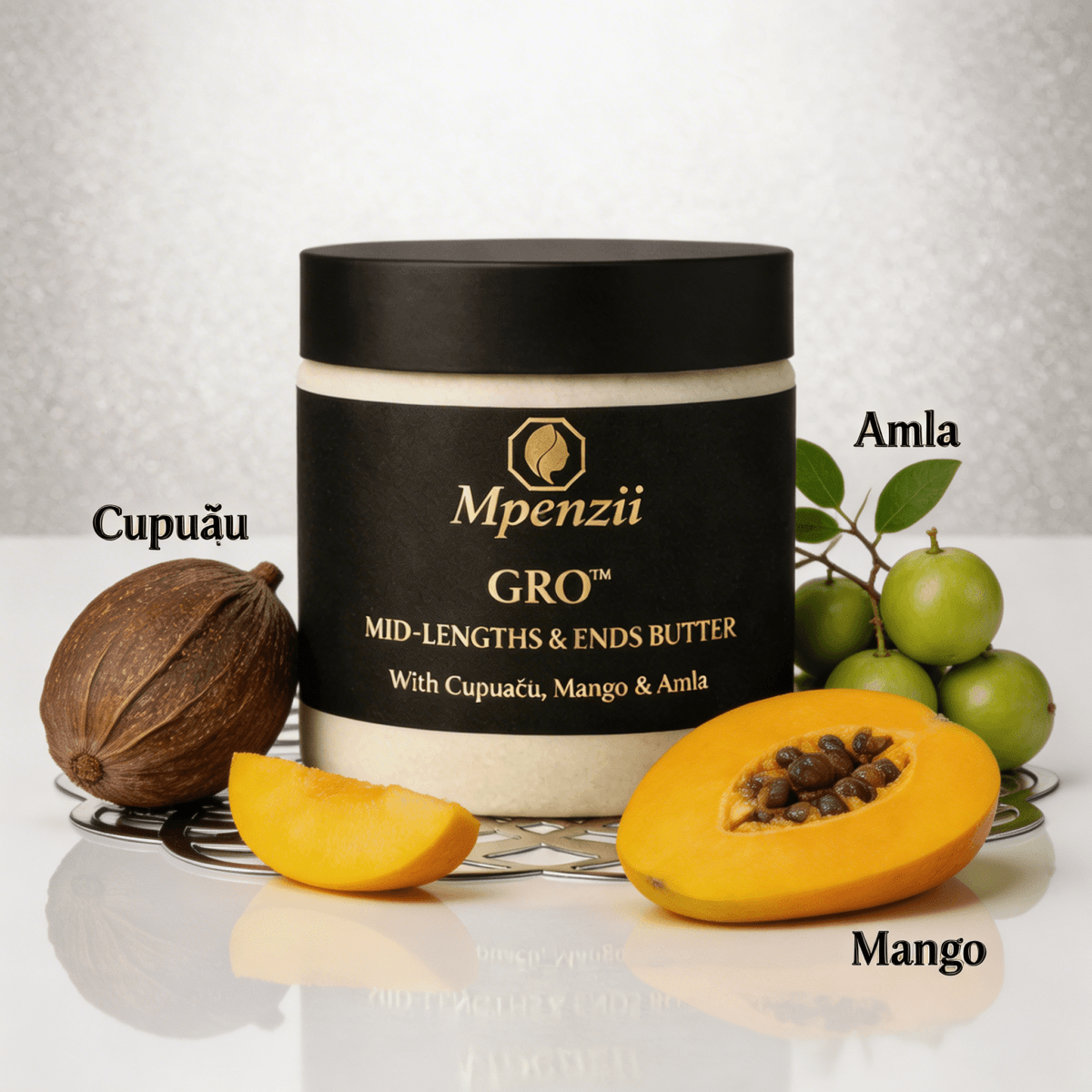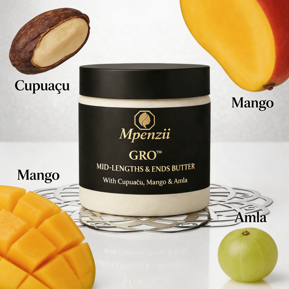 Cupuaçu butter contributes high water-binding capacity and elasticity support within the hair fibre. Mango butter provides structured softness and controlled occlusion. Amla infusion is incorporated for its antioxidant profile and its traditional use in hair-conditioning applications. Together, these components form a cohesive butter base designed to support mid-length integrity and reduce surface roughness.