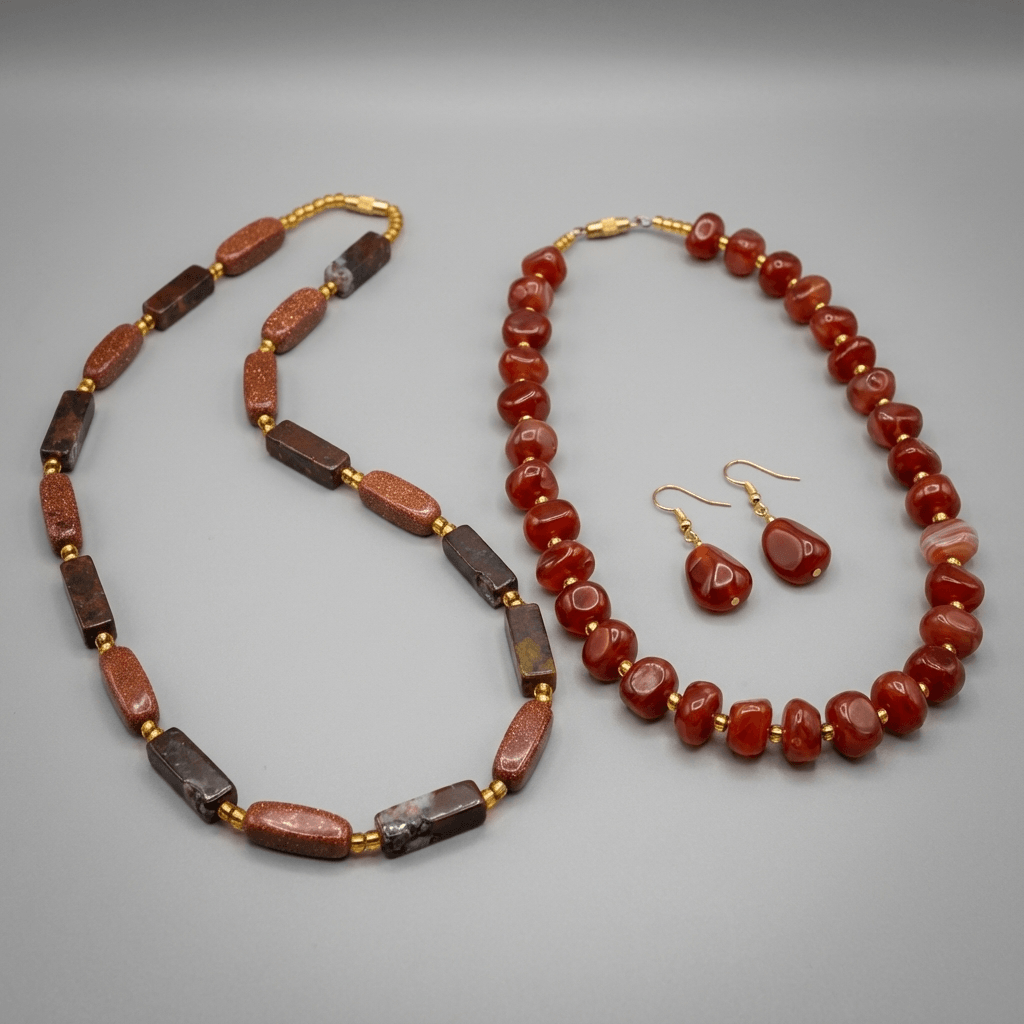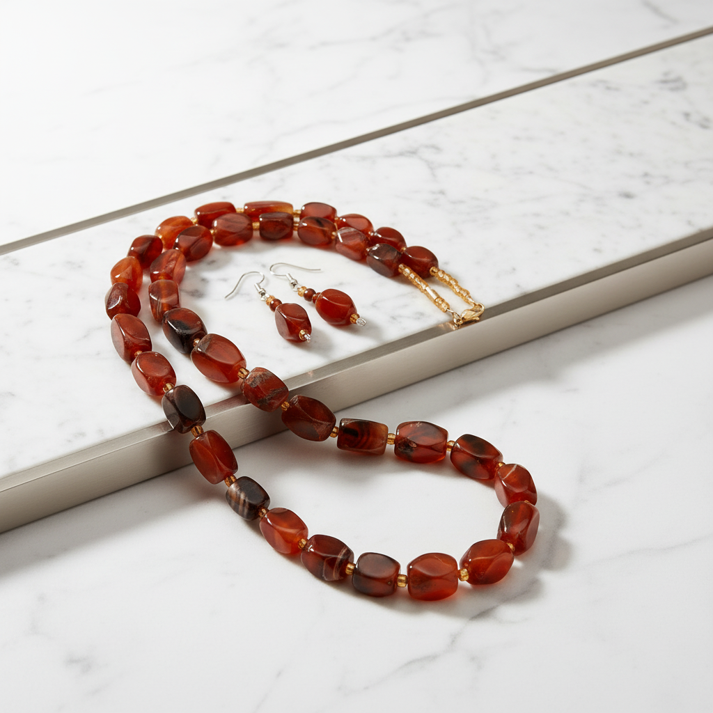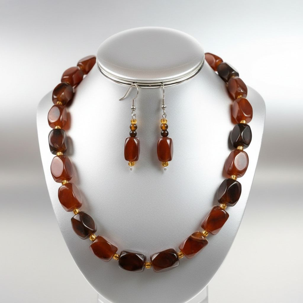 Layered mineral tonality defines this carnelian and banded agate jewelry set, composed in warm amber and deep brown hues.