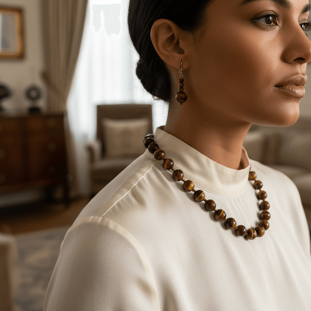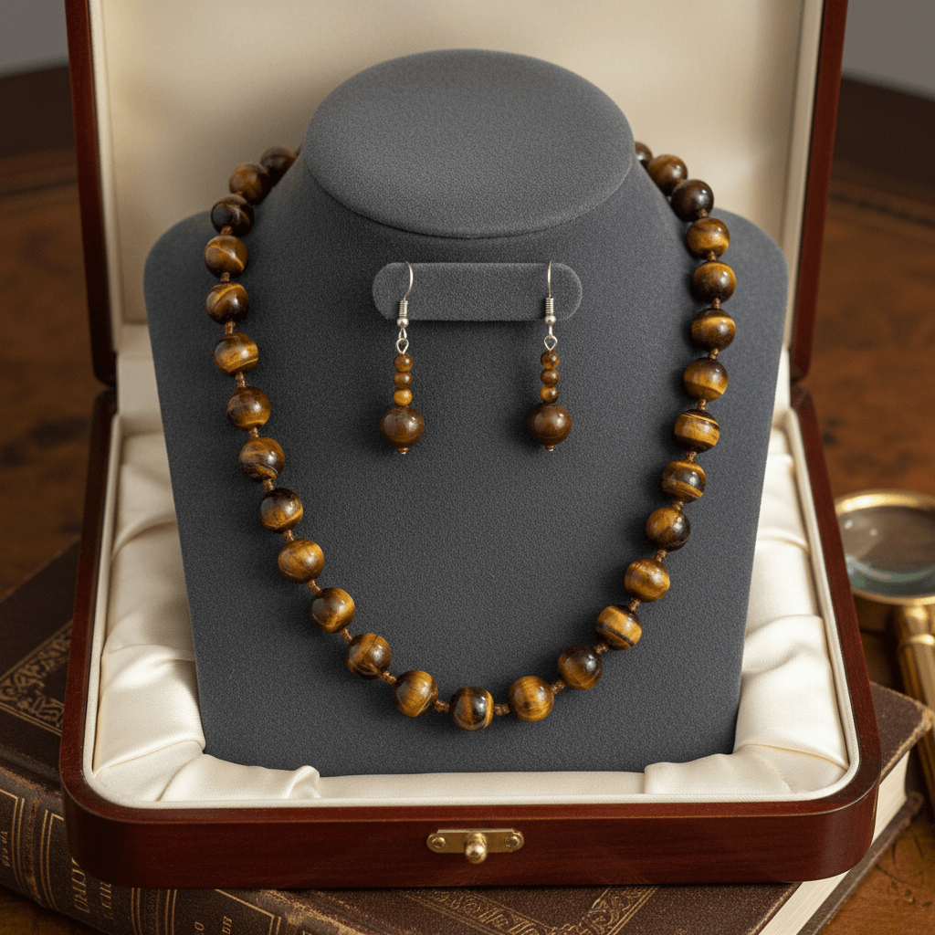 A composed expression of natural pattern and tonal depth. This set features tiger eye beads, each revealing layered bands of golden brown and deep earth tones that shift subtly with light.