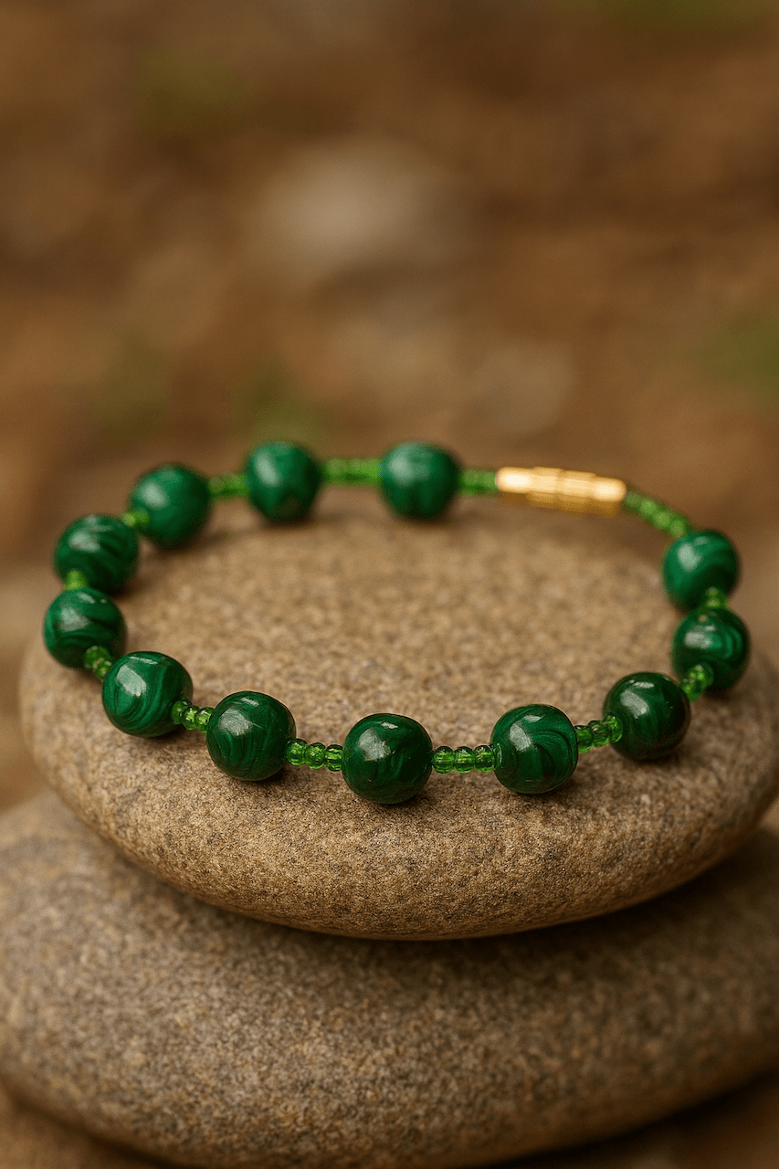 A composed arrangement of natural malachite shaped into uniform round beads, revealing layered green banding unique to each stone. The tonal depth ranges from emerald to forest green, creating movement across a refined circular silhouette.