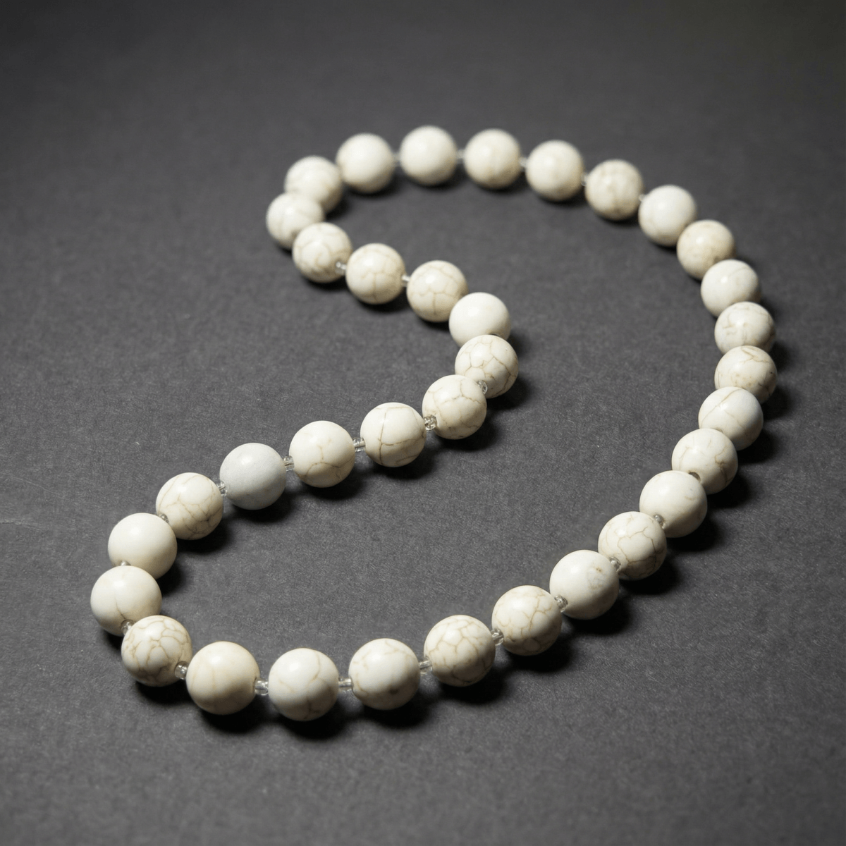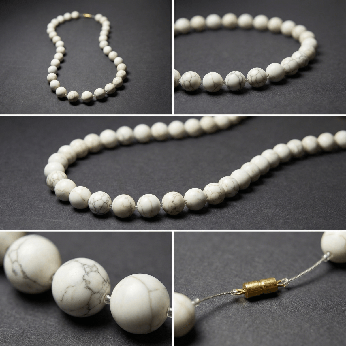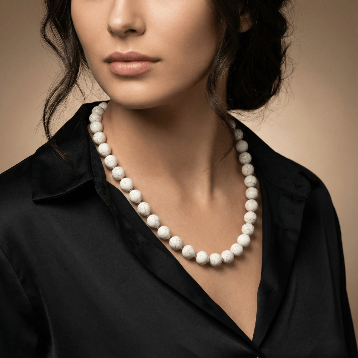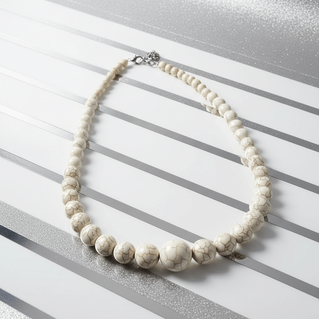 A controlled gradient of polished howlite beads forms the structure of this ivory white necklace, transitioning from smaller rounds at the clasp to fuller spheres at the center. The subtle veining characteristic of howlite moves across each bead like fine mineral tracery, introducing quiet visual texture without disrupting the overall balance.